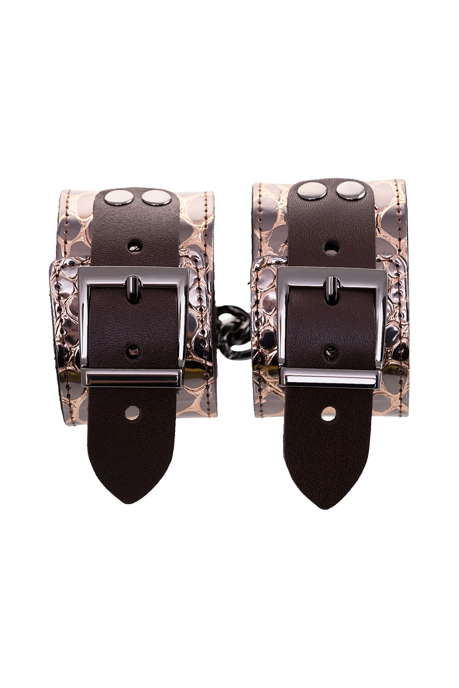 Наручники изготовлены из натуральной кожи. Регулируются при помощи металлических пряжек. Наручники соединяются карабинами. Общая длина 27 см. Ширина 4,6 см. ..