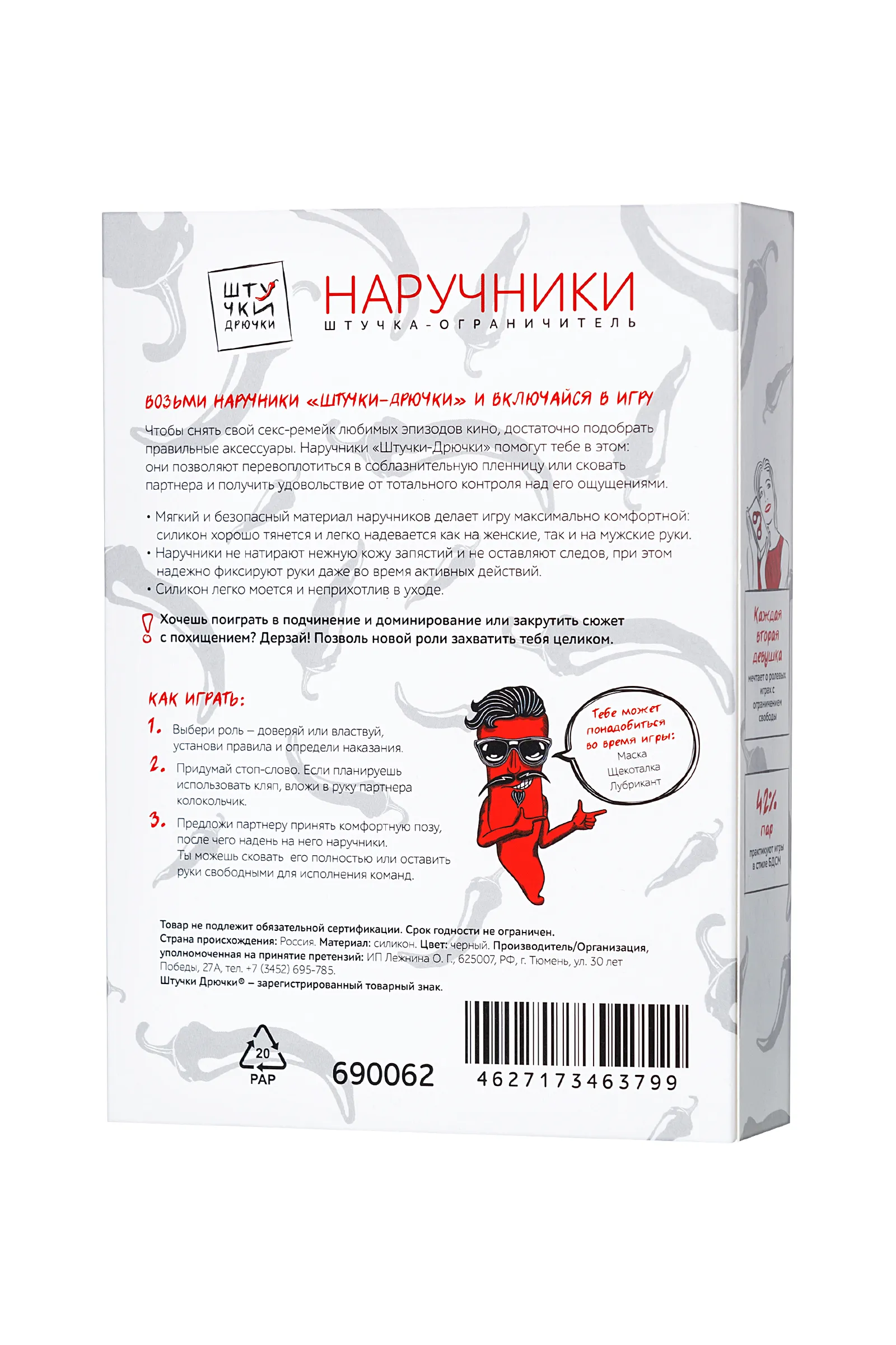 Возьми наручники «Штучки-Дрючки» и включайся в игру. Чтобы снять свой секс-ремейк любимых эпизодов кино, достаточно подобрать правильные аксессуары. Наручники «Штучки-Дрючки» помогут тебе в этом: они позволяют перевоплотиться в соблазнительную пленницу или сковать партнера и получить удовольствие от тотального контроля над его ощущениями. Мягкий и безопасный материал наручников делает игру максимально комфортной: силикон хорошо тянется и легко надевается как на женские, так и на мужские руки. Наручники не натирают нежную кожу запястий и не оставляют следов, при этом надежно фиксируют руки даже во время активных действий. Силикон легко моется и неприхотлив в уходе. Хочешь поиграть в подчинение и доминирование или закрутить сюжет с похищением? Дерзай! Позволь новой роли захватить тебя целиком.