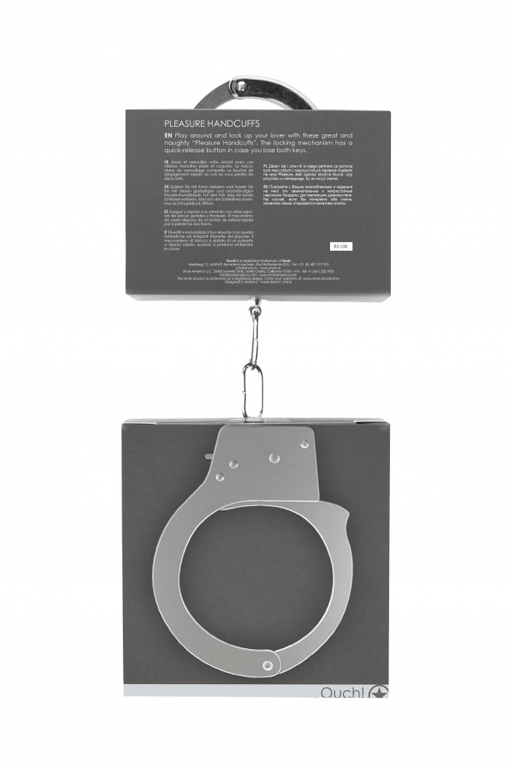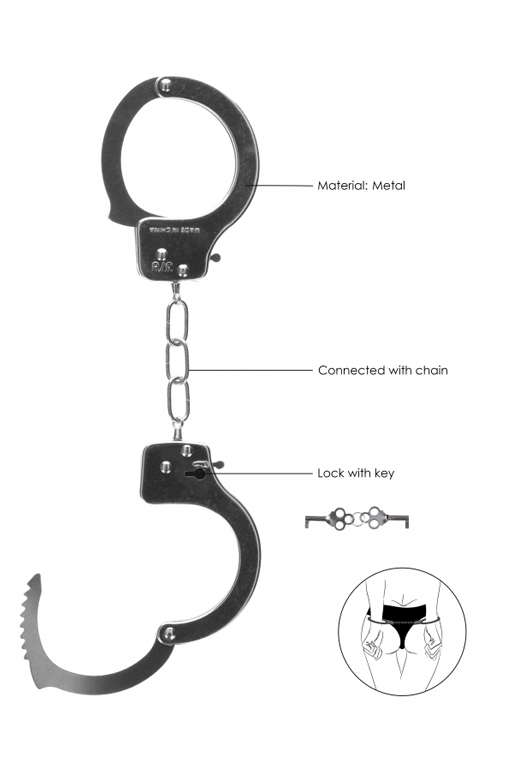 Металлические наручники Pleasure Handcuffs - специализированное приспособление для жесткой и надежной фиксации и обездвиживания партнера при эротических ролевых играх и практиках БДСМ. Классические металлические наручники могут открываться как при помощи ключей, входящих в комплект, так и с помощью механизма непосредственно на них. Кольца соединены между собой короткой неэластичной сцепкой.