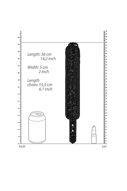 Аксессуар состоит из двух сверхпрочных и стильных широких полос из блестящего винила с ромбовидным рисунком, соединенных между собой снимающейся зачерненной цепочкой с карабинами по обоим бокам. Для максимального комфорта во время использования наручники имеют мягкую вставку из неопрена, закрывающую швы и стыки и защищающую запястья. Фиксация осуществляется с помощью ремешка с классической пряжкой. Имеется 6 отверстий, за счет чего можно идеально подобрать требуемый размер с идеальным плотным обхватом.