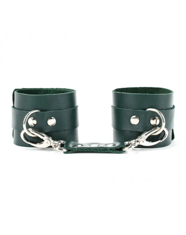 Наручники выполнены из натуральной кожи бордового цвета. Металлическая пряжка крепко удерживает в подчинении, кожаное соединение на карабинах фиксирует наручники вместе, ремни позволяю выбрать нужный размер. Стильный аксессуар поможет воплотить эротические фантазии в реальность.