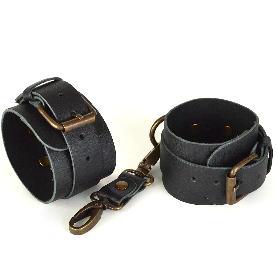 Наручники изготовлены из натуральной кожи черного цвета. Соединяются перемычкой с двумя карабинами. Длина основы 25 мм. Длина узкого ремешка с пряжкой 31 см. Длина упаковки 16, ширина 13, высота 8 см. Вес брутто 161 г.