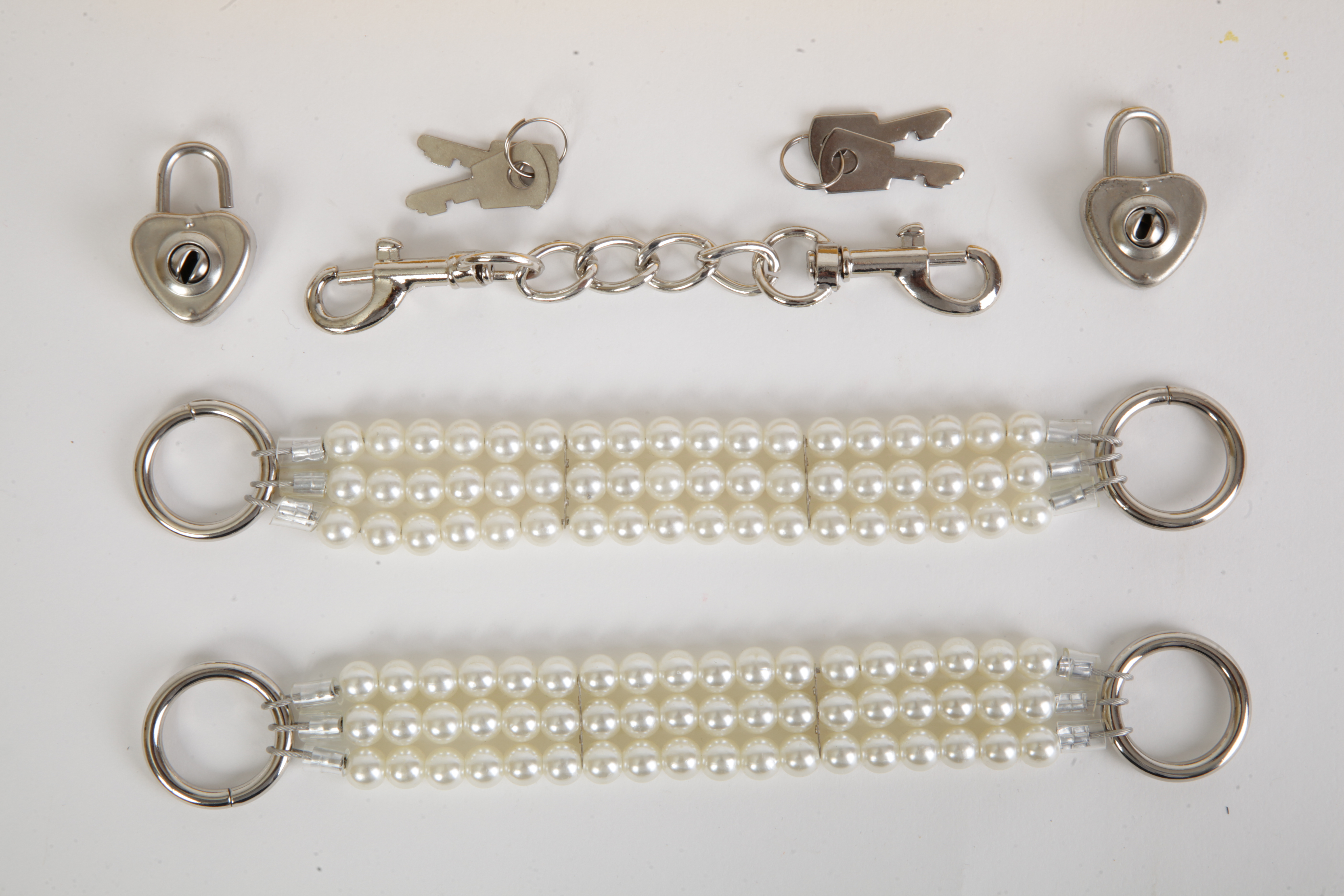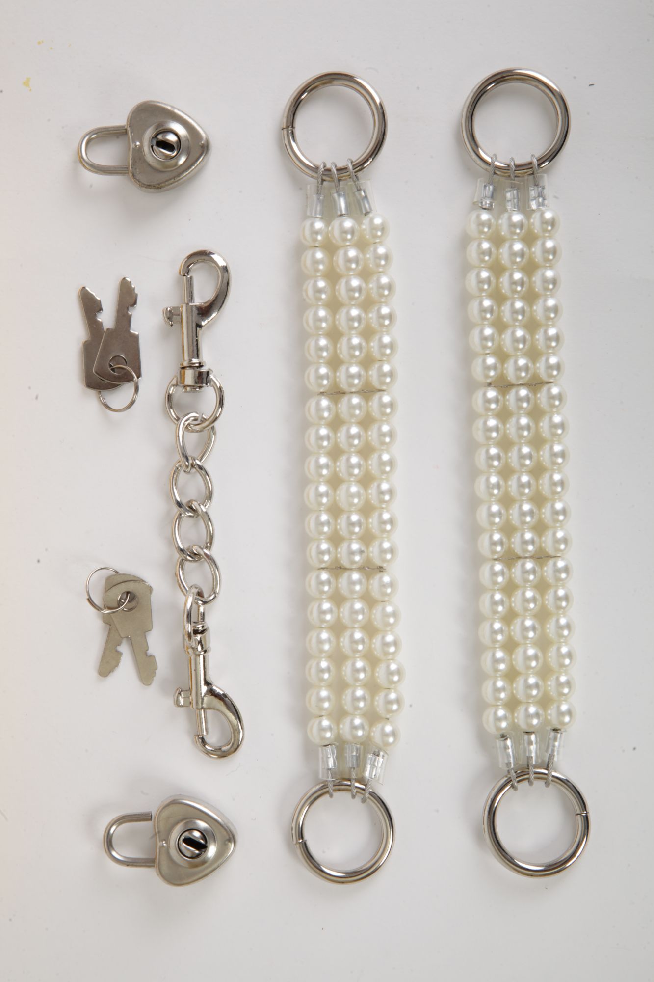 Белые наручники с тремя нитями из жемчуга. Закрываются на замочки в виде сердечек с индивидуальными ключиками. Наручники можно соединить небольшой цепочкой с карабинами (длина- 13 см). Длина наручников- 20 см, ширина- 2,5 см. Упаковка- золотая подарочная коробка с бантом.