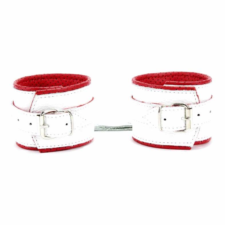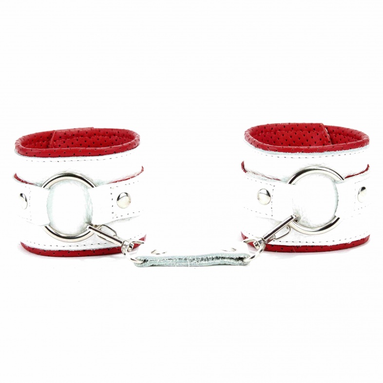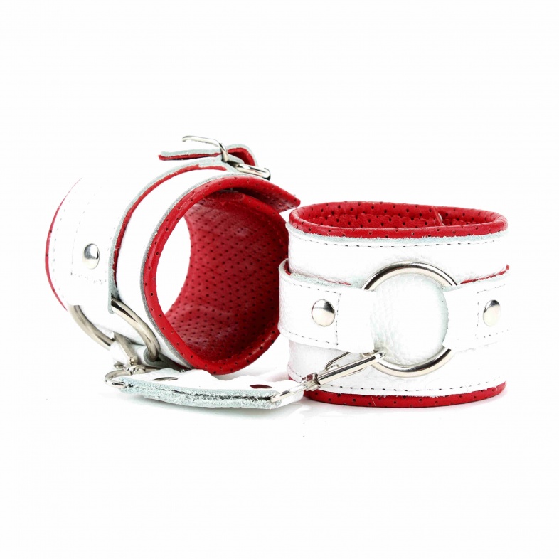 Наручники из белой кожи с кольцом с мягким подкладом из перфорированной кожи. Сварная металлическая фурнитура для надежной фиксации. Ширина - 6 см.,Не нарушают кровообращение, надёжно фиксируются на запястьях с помощью ремешков. Размер универсальный, регулируемый.