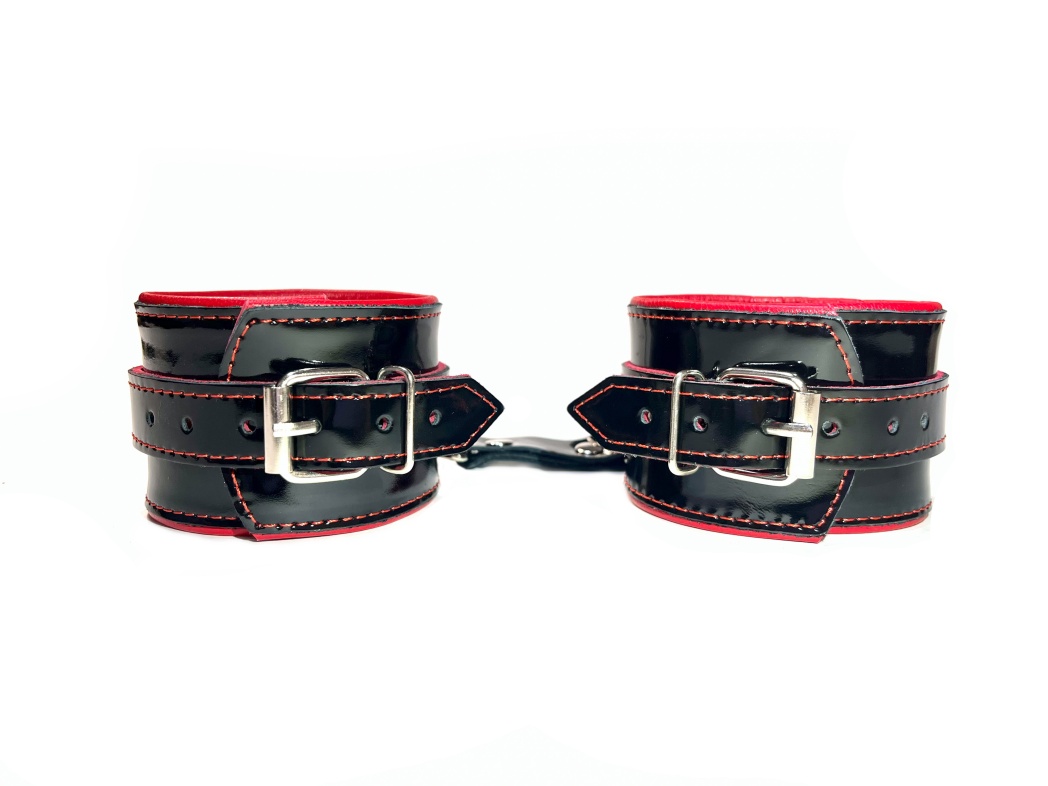Наручники выполнены из черной натуральной лакированой кожи. Подклад изделия из нежнейшей красной овечьей кожи.Аксессуар декорирован металлическими заклёпками.Наручники надежно фиксируются пряжками и ремнями, позволяющими выбрать нужный размер,подойдут на обхват руки от 13 до 23см, ширина наручников 5,5см.Кожаное соединение на карабинах фиксирует наручники вместе, общая длина соединения 14см. На каждом аксессуаре два полукольца из сварной фурнитуры. Стильные наручники помогу воплотить эротические фантазии в реальность.