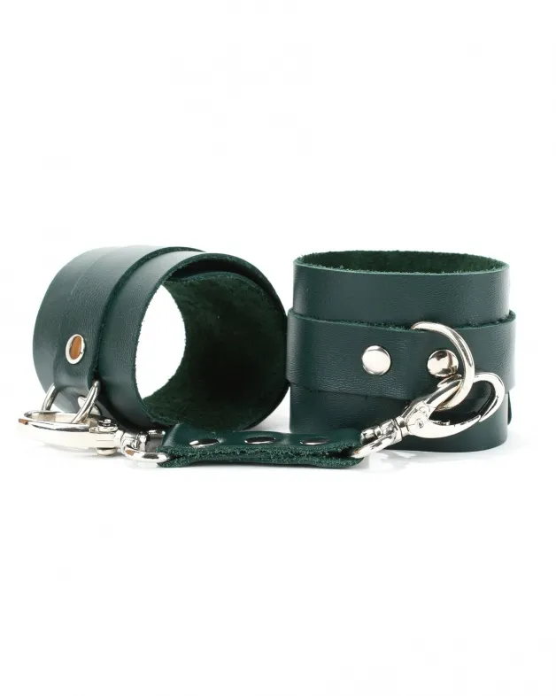 Оковы выполнены из натуральной кожи изумрудного цвета. Металлическая пряжка крепко удерживает в подчинении, кожаное соединение на карабинах фиксирует наручники вместе, ремни позволяю выбрать нужный размер.  Стильный аксессуар поможет воплотить эротические фантазии в реальность.