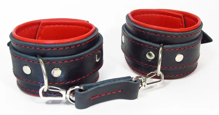 Оковы на ноги с красным подкладом. Выполнены из толстой ременной кожи черного цвета, подклад мягкая перчаточная кожа ярко красного цвета. На пряжке. Использована усиленная металлическая фурнитура. Строчка толстой ниткой контрастного красного цвета.