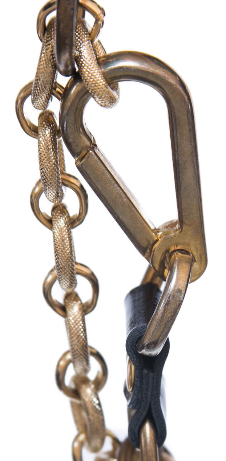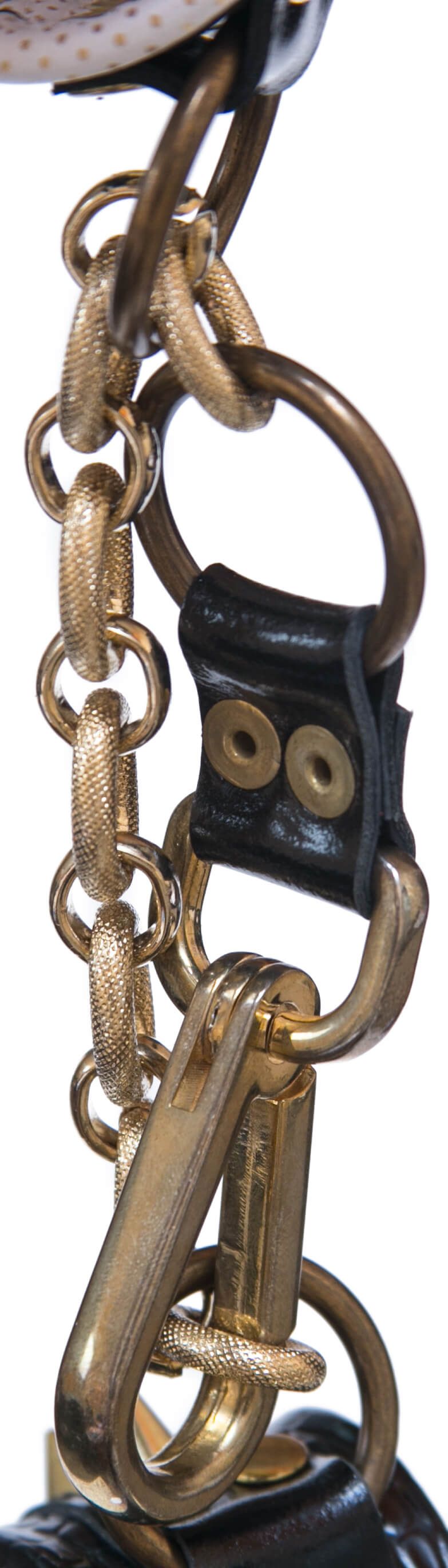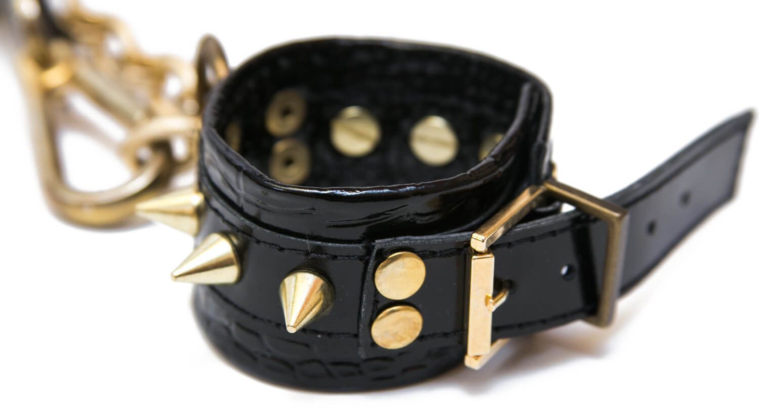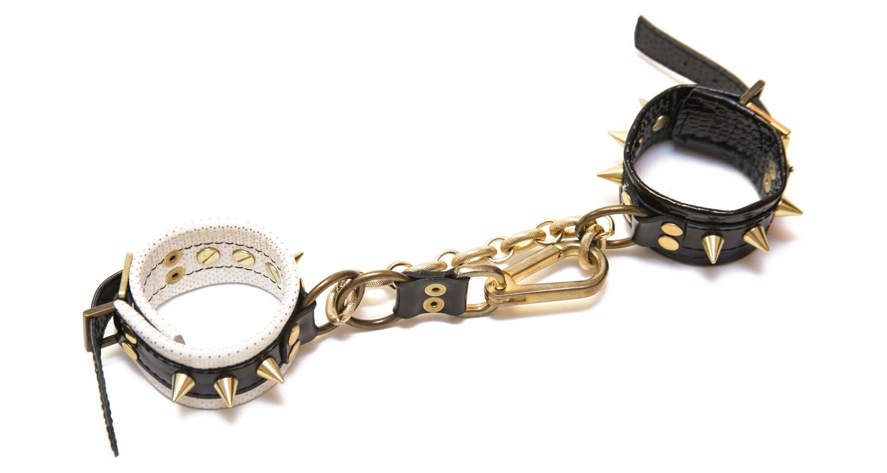 Черно-белые наручники от компании Индиго сделаны из кожи и соединены между собой металлической цепочкой и карабином. Наручники декорированы шипами и клепками, к тому же все металлические детали имеют золотистый цвет. Наручники легко регулируются. С помощью таких стильных наручников Вы можете привнести разнообразие и остроту в Ваши отношения.
