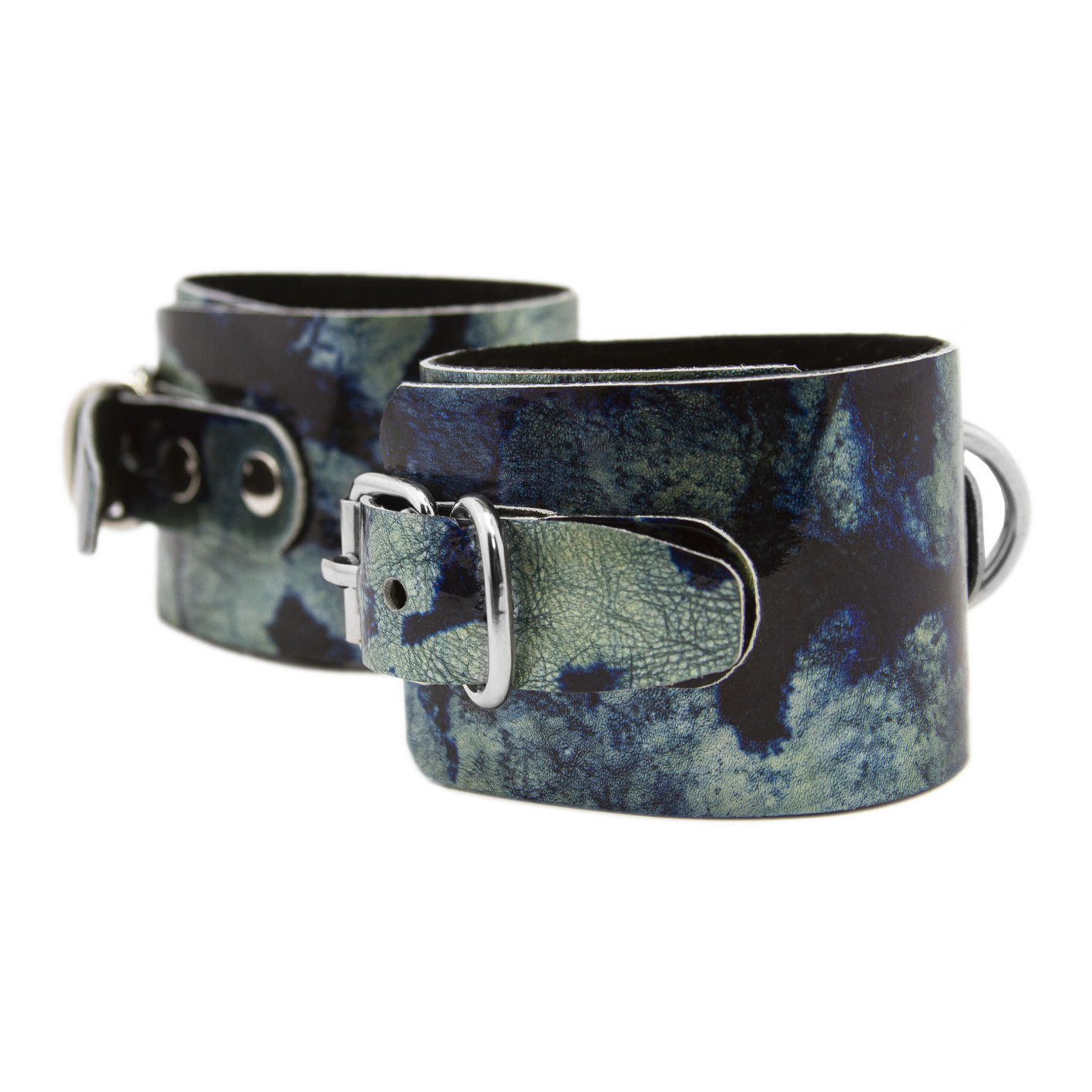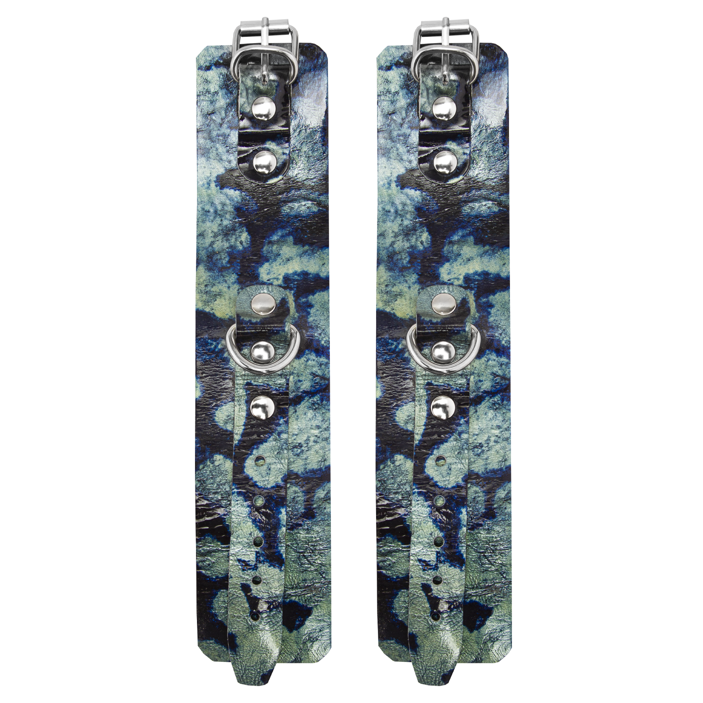 Наручники выполнены из натуральной кожи и декорированы металлическими клепками. Также у них есть D-образные кольца, к которым можно будет присоединять другие бондажные аксессуары. Наручи не нарушают кровообращение, просты в применении и обеспечивают надежную фиксацию. Их размер регулируется при помощи ремешков с пряжками.