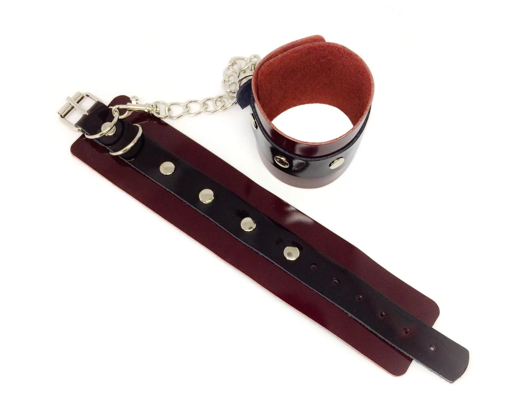 Наручники от бренда I Sexy выполнены из натуральной лакированной кожи бордового и черного цветов и декорированы блестящими хольнитенами. Наручники соединены между собой крепкой стальной цепочкой, которую при желании можно будет отцепить и использовать сами браслеты в качестве напульсников. Их размер можно регулировать при помощи ремешка с пряжкой. Наручники будут приятно прилегать к телу, они стильные, прочные и долговечные.