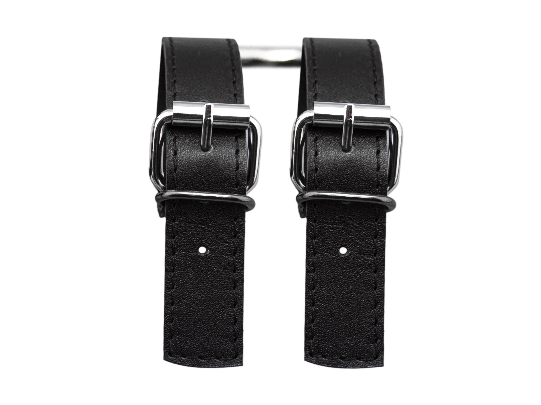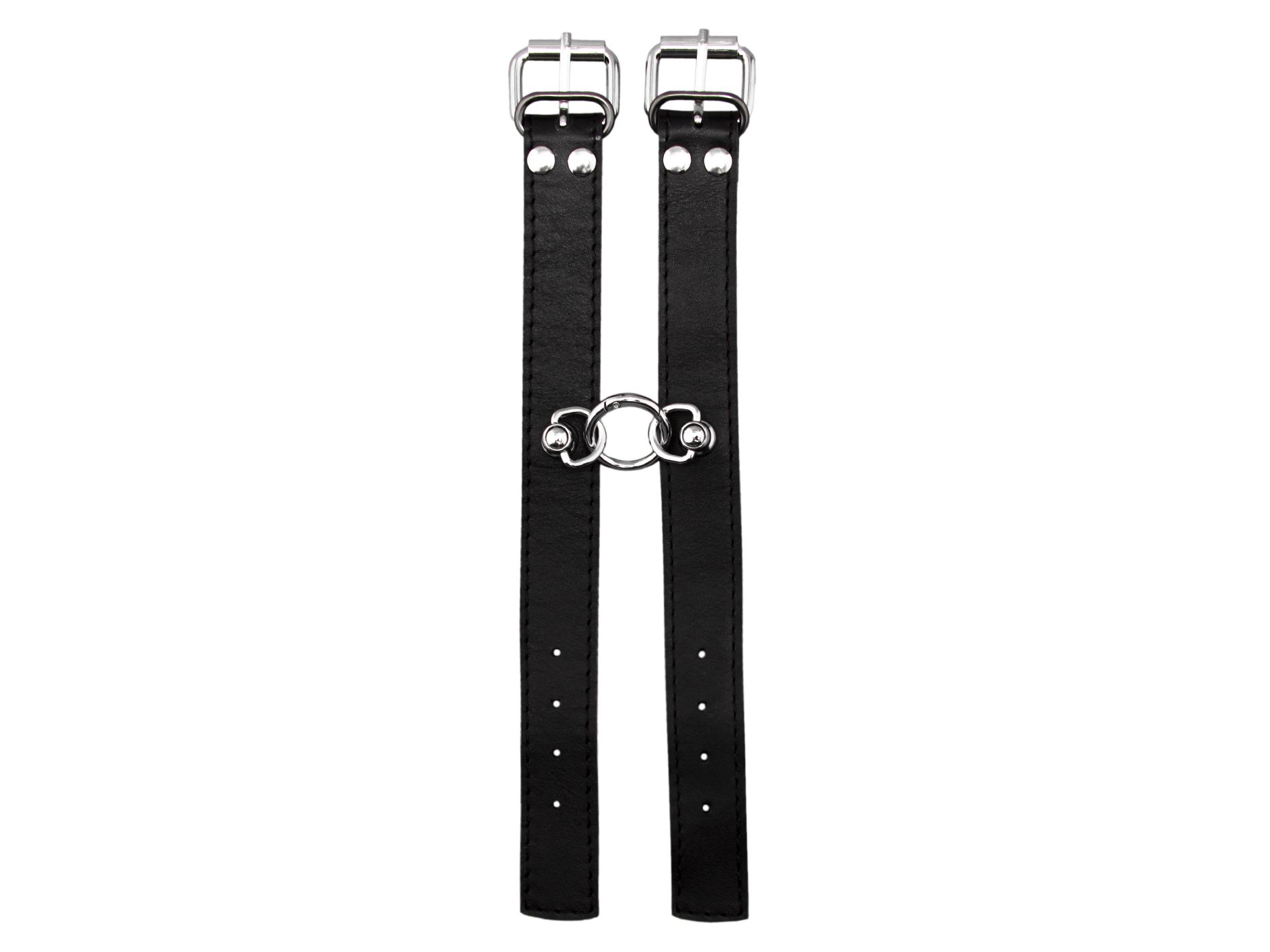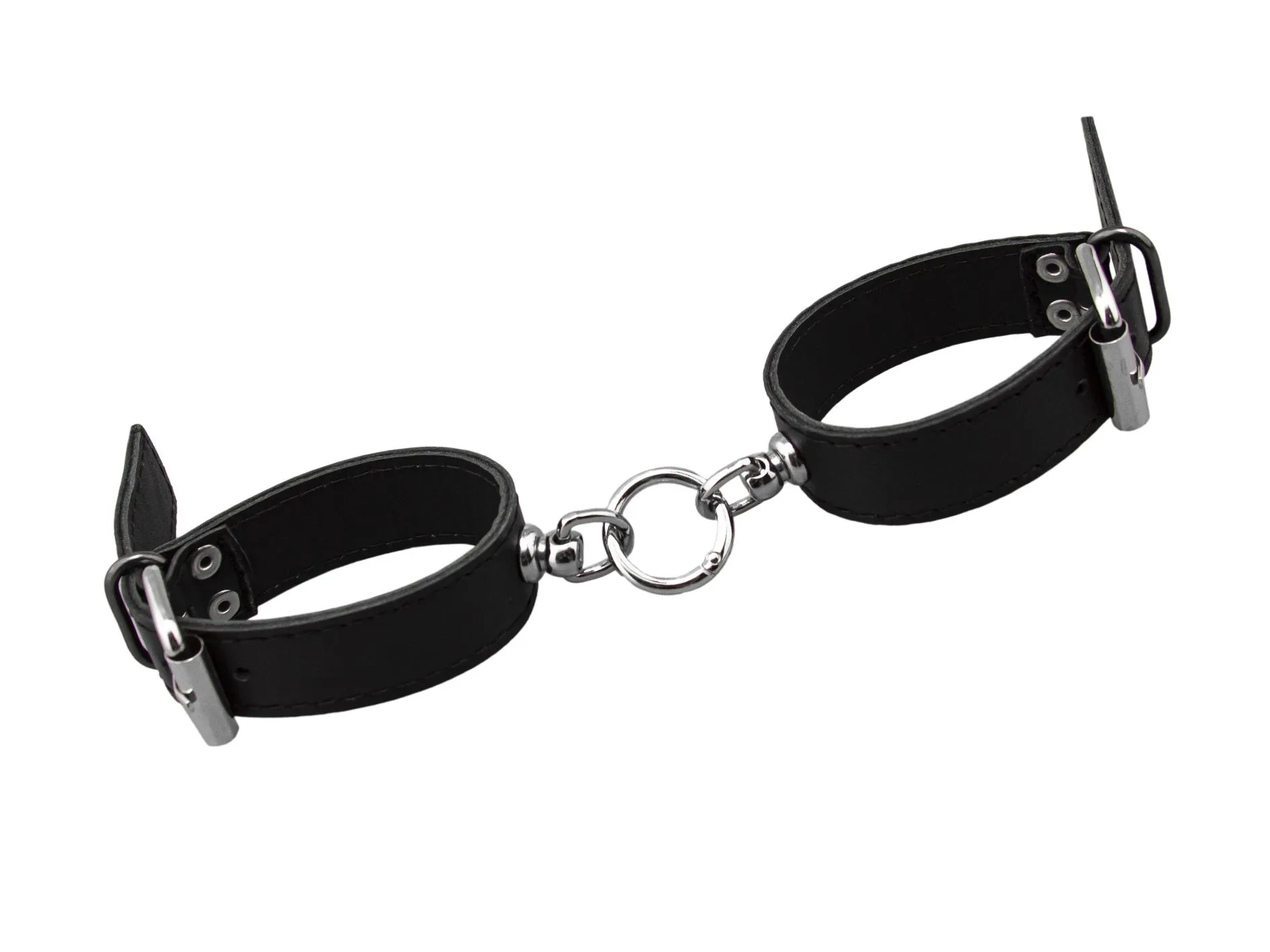 Наручи выполнены из натуральной кожи черного цвета и между собой соединены металлическим кольцом. Их можно использовать как сексуальное и дерзкое украшение, которое дополнит Ваш ролевой эротический костюм. Или же можно соединить их при помощи цепи или карабина, чтобы они смогли зафиксировать руки Вашего партнера. Невозможность двигать руками обострит все чувства партнера, делая его особенно чувствительным ко всем прикосновениям. Наручи разнообразят Ваши интимные игры и позволят испытать новые ощущения во время секса. Наручники регулируются по размеру.