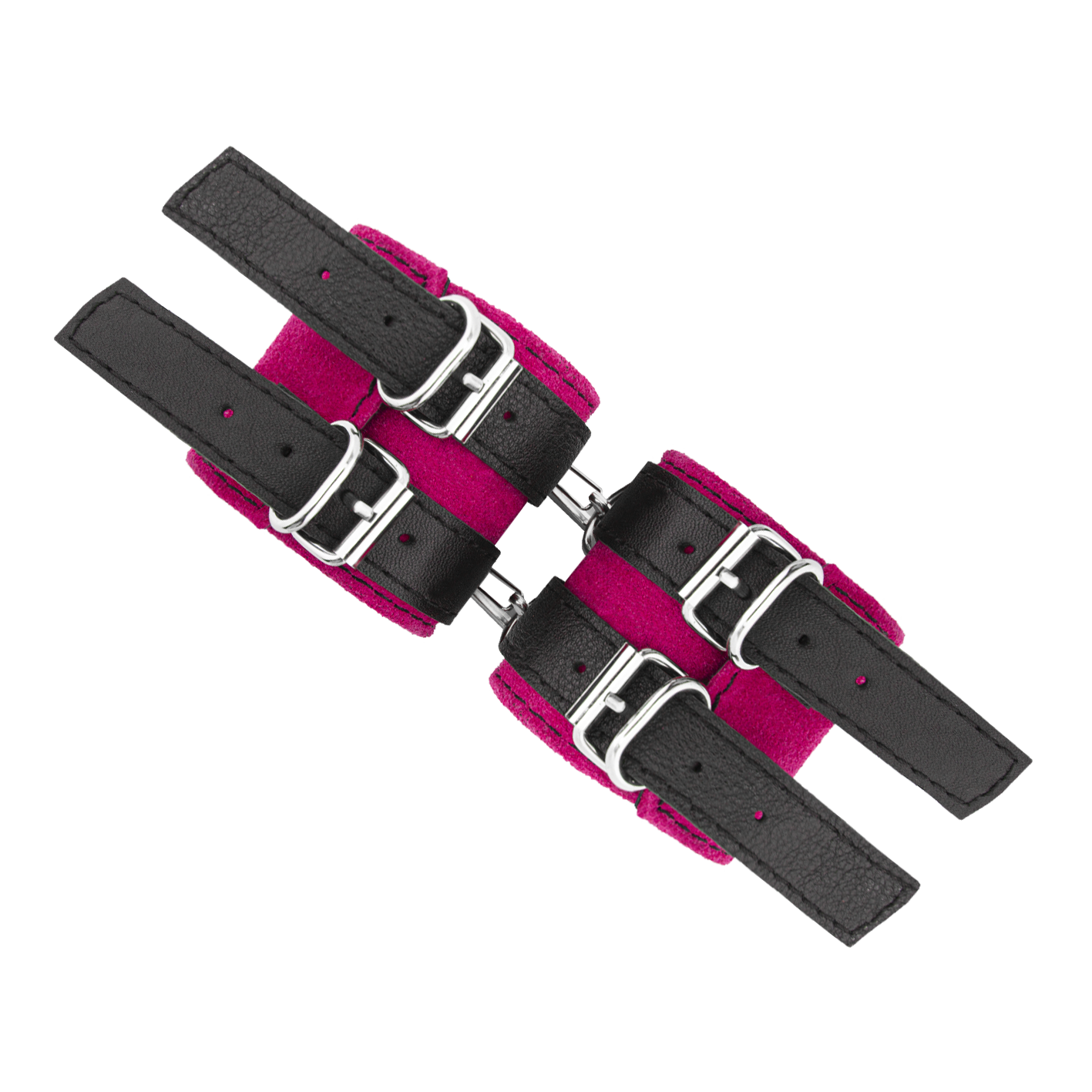 Наручники соединены между собой металлическими карабинами. Их можно регулировать по размеру ремешками с пряжками.