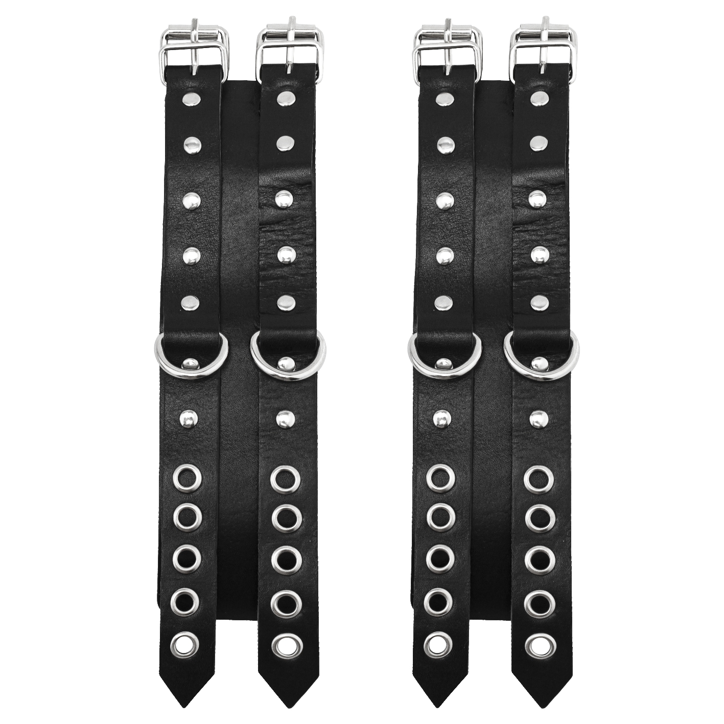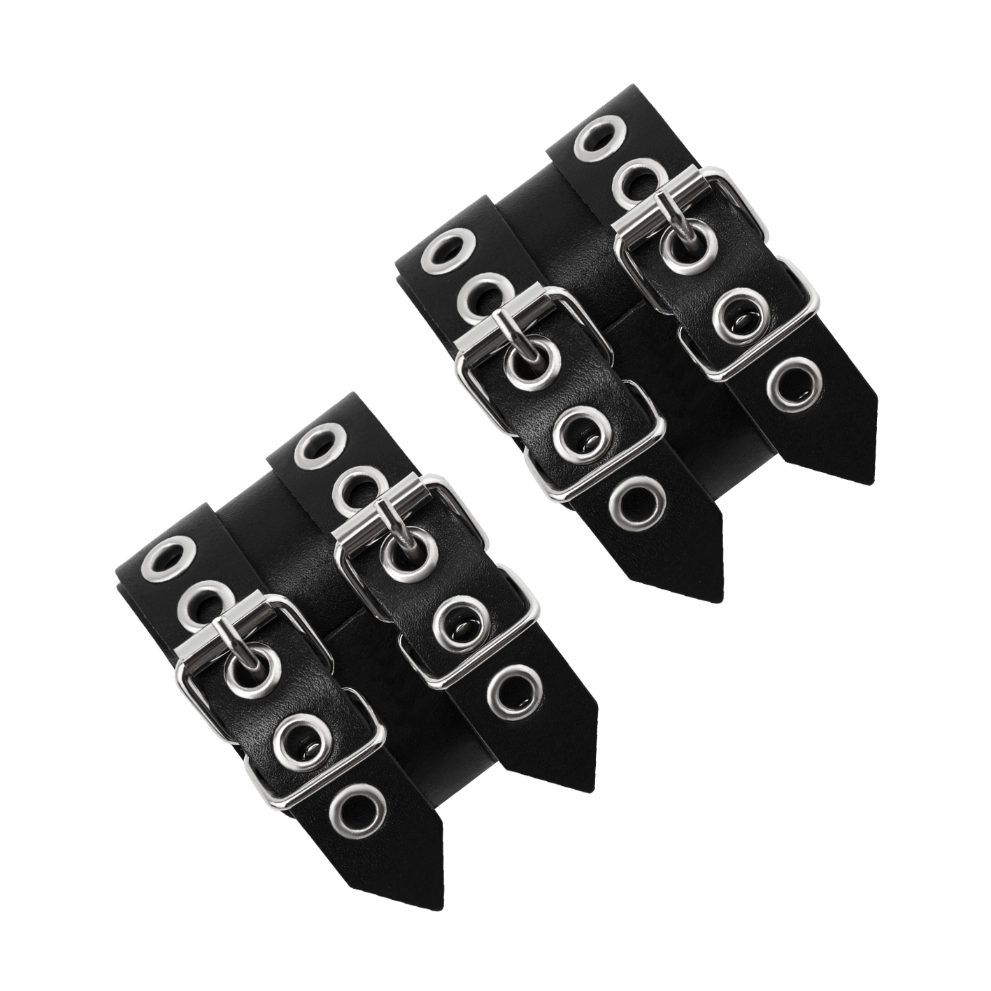Наручники соединены между собой металлическими карабинами. Их можно регулировать по размеру ремешками с пряжками.