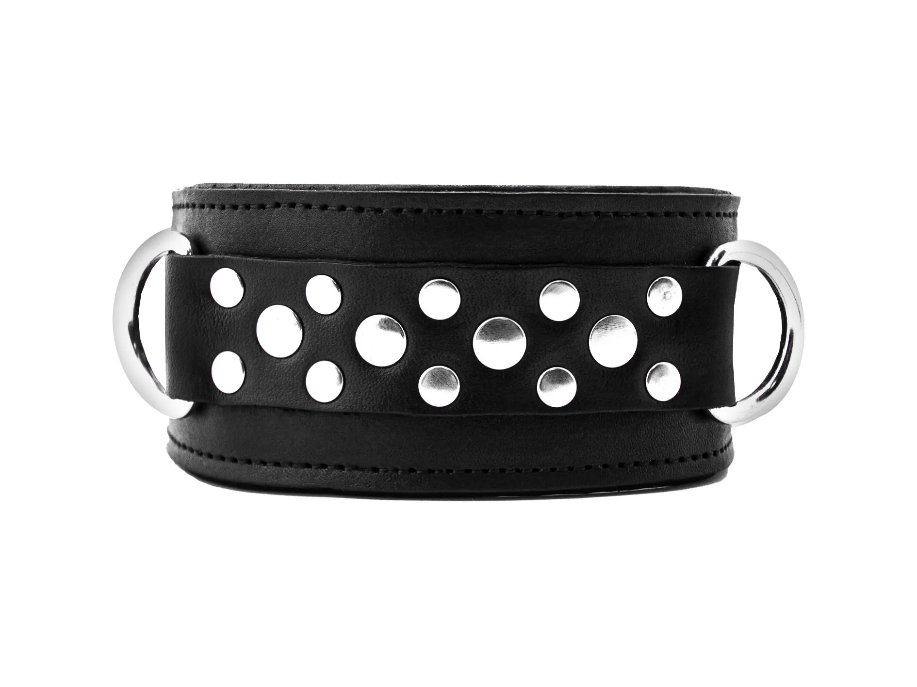 Ошейник выполнен из натуральной кожи высокого качества и декорирован геометрическим рисунком из двух видов заклепок. Он оснащен тремя D - кольцами, которые обеспечивают удобство крепления различных бандажных систем (карабины, веревки, ленты). Мягкая подкладка обеспечит максимальный комфорт и безопасность при использовании. Застегивается bdsm ошейник на ремешок с пряжкой. Поводок в комплект не входит