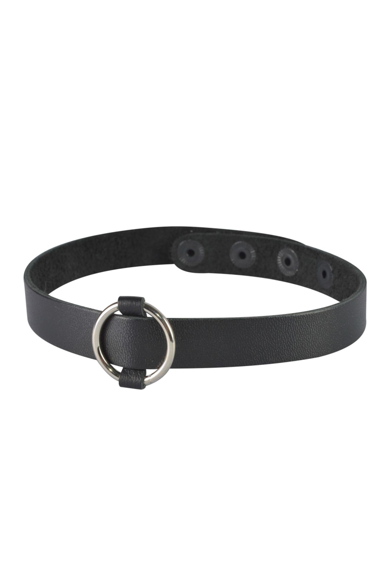 Чокер  из натуральной кожи черного цвета, декорирован  металлическим кольцом. Регулируется при помощи кнопок. Длина 40 см, ширина 1,5 см. Металлическое кольцо имеет никелевое покрытие.
