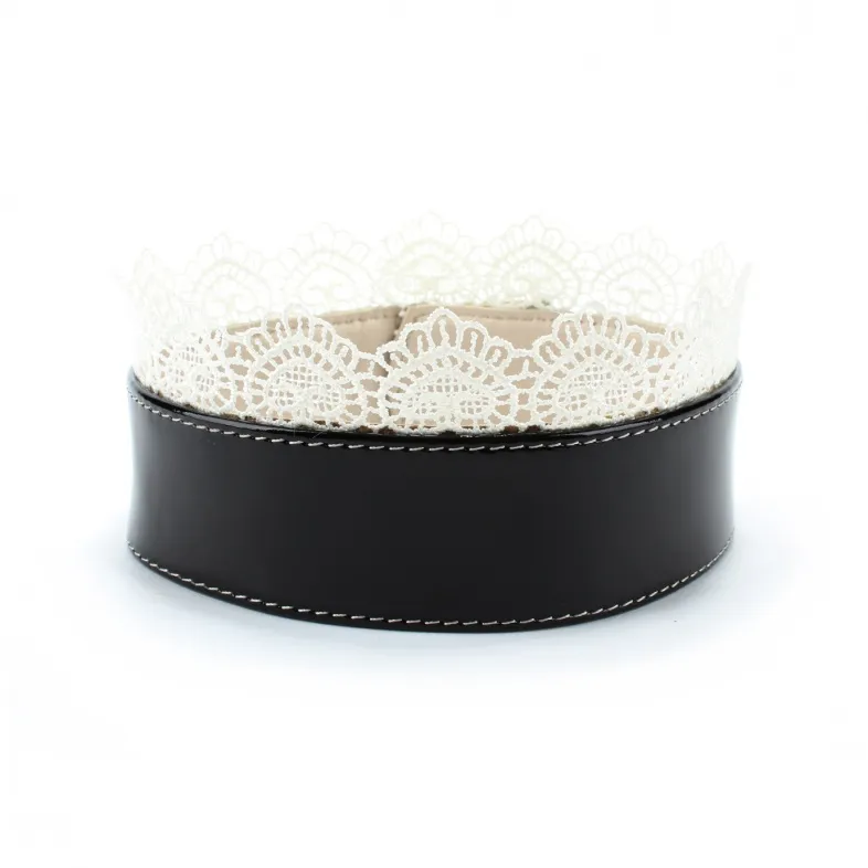 Черный ошейник с белым кружевом, изготовлен из натуральной лаковой кожи. Характеристика: длина ошейника- 41 см, ширина ошейника- 3,8 см, ширина ошейника с кружевом- 6,5 см. Имеет 6 отверстий для регулировки размера. Упаковка: картонная подложка.