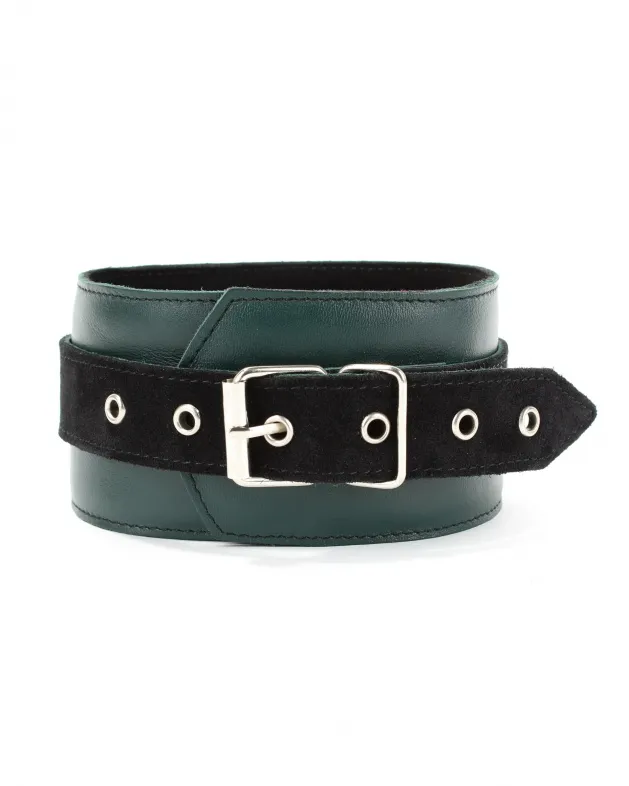 Ошейник выполнен из натуральной кожи изумрудного цвета, декорирован вставкой из черной замши, заклепками, металлическим кольцом и двумя полукольцами. Сзади аксессуар надежно фиксируется пряжкой, ремень позволяет выбрать нужный размер. Мягкий подклад из замши обеспечит комфортное пребывание в аксессуаре.