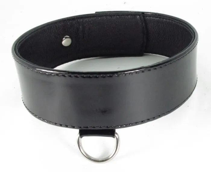 Ошейник черного цвета, выполнен из высококачественной кожи/лак. Ширина фетиш атрибута составляет 3,7 сантиметров. Размер регулируется при помощи застежек с делениями. Для крепления различных элементов бандажа, а также поводков и цепочек на БДСМ девайсе предусмотрено одно сварное D-видное кольцо. Общая длина ошейника - 42 см. Упаковка- картонная подложка.