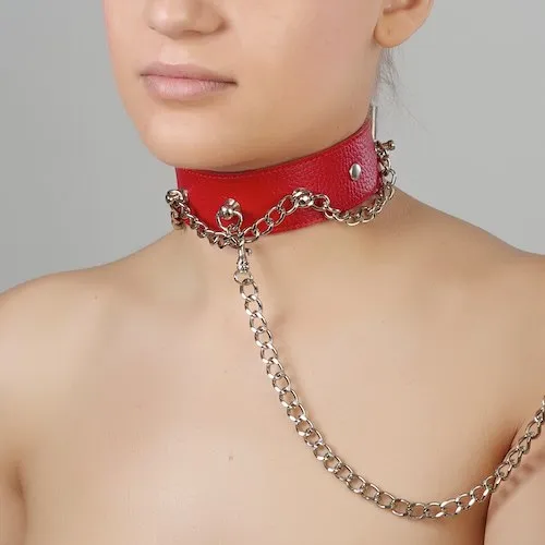 —Ошейник красный с металлической цепочкой по окружности и с цепочкой-поводком 3117-2