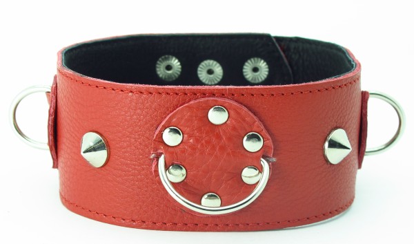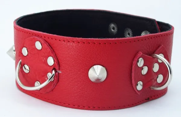 Красный кожаный ошейник с короткими шипами. Имеет три кольца для карабинов, два ряда заклепок-застежек. Ширина ошейника - 5см. Размер регулируется.