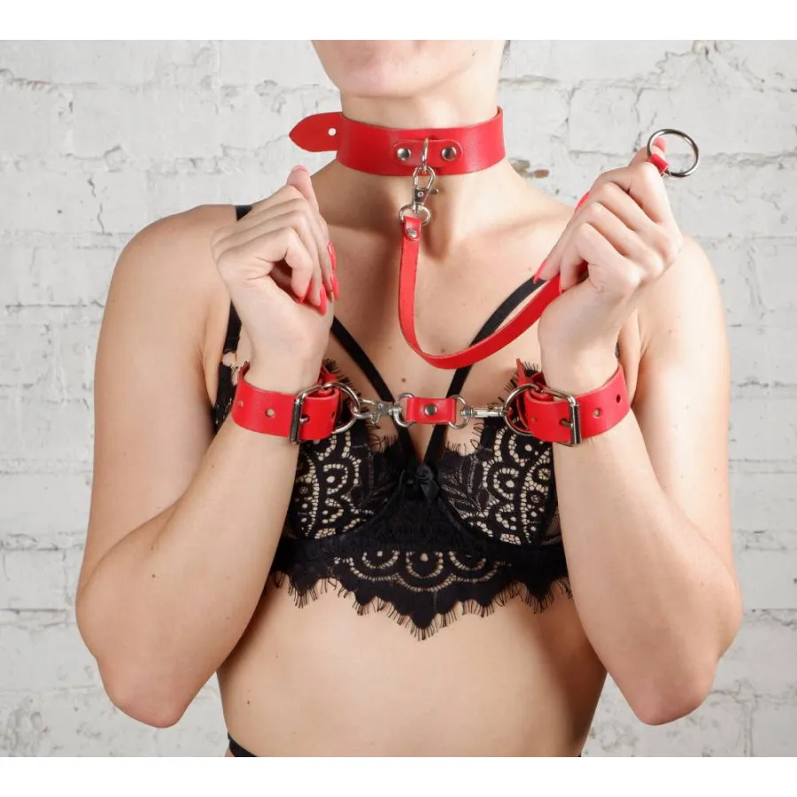 Ошейник изготовлен из натуральной кожи красного цвета. Поводок в виде кожаной ленты с карабином с одной стороны и колечком с другой. Регулируется при помощи пряжки.