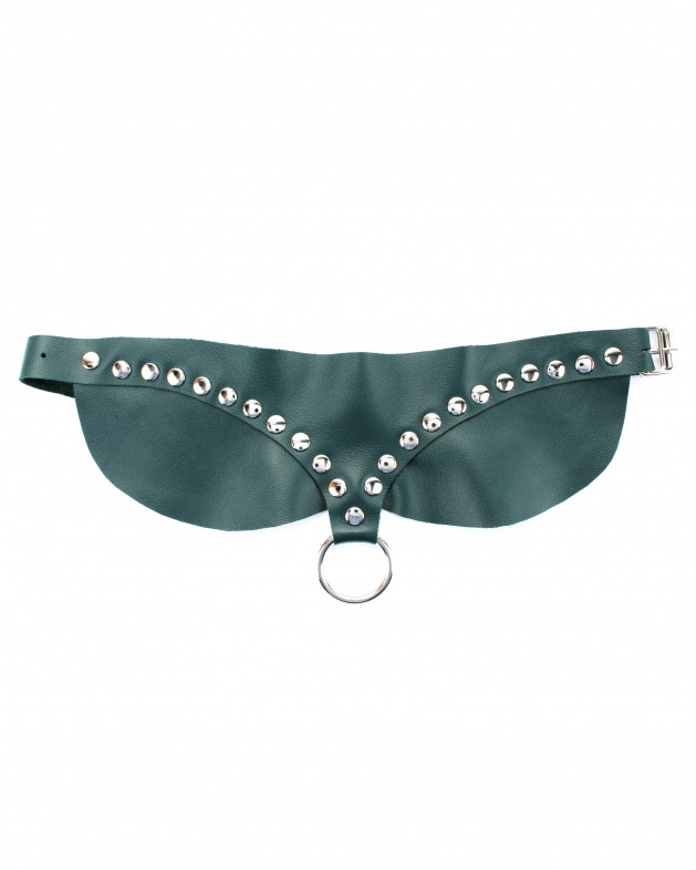 Ошейник выполнен  из натуральной кожи изумрудного цвета, декорирован заклепками в иде V символа и металлическим кольцом  спереди. Сзади аксессуар надежно фиксируется пряжкой,  ремень  позволяет  выбрать нужный размер.  Стильный аксессуар поможет воплотить эротические фантазии в реальность.