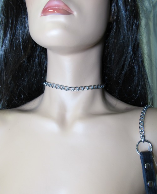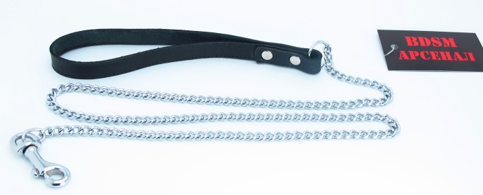 Поводок изготовлен из натуральной кожи. При изготовлении использована фурнитура с никелевым покрытием. Металлическая цепочка (поводок), с карабином на конце, поможет вам с лёгкостью управлять своим партнёром. Длина цепочки - 90 см., ширина - 0,8 см