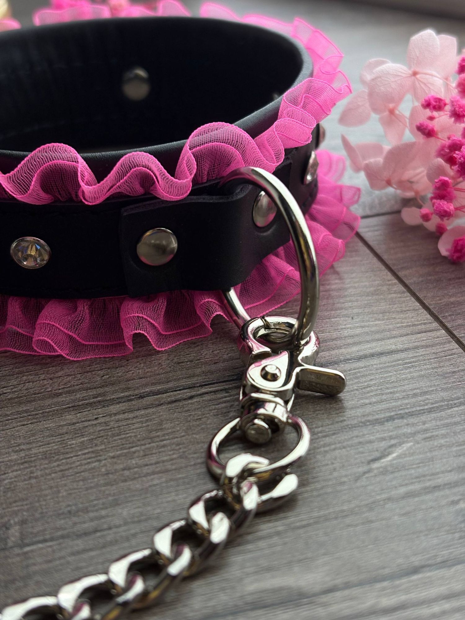 Основа - натуральная кожа, декор - рюши и стразы, поводок-цепь в комплекте