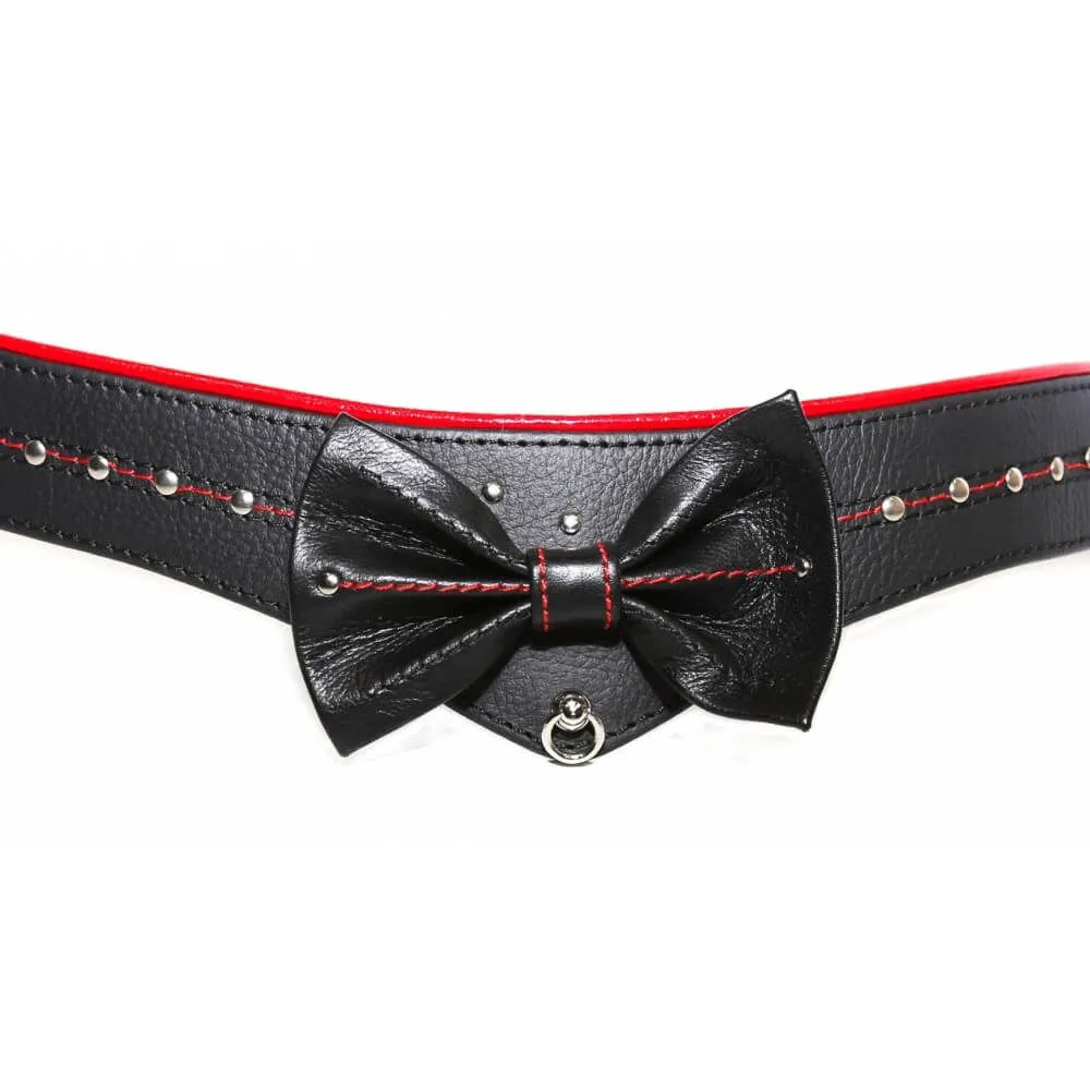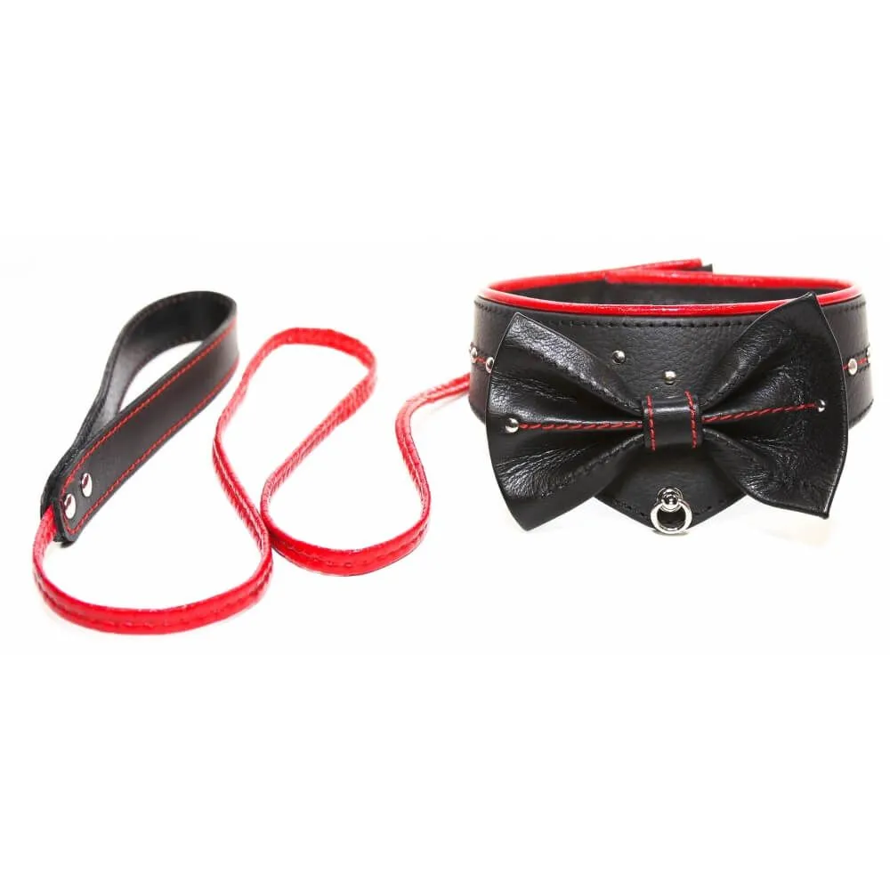 Оригинальный ошейник с бабочкой непременно внесет разнообразие острых ощущений в Ваши сексуальные игры. Ошейник выполнен из настоящей кожи черного и красного цветов и декорирован заклепками, красными нитями и бабочкой из кожи. Кроме этого он оснащен красным поводком, который пристегивается к кольцу на ошейнике с помощью карабина. Подчините партнера своим желаниям или подчинитесь ему сами с этим великолепным аксессуаром.
