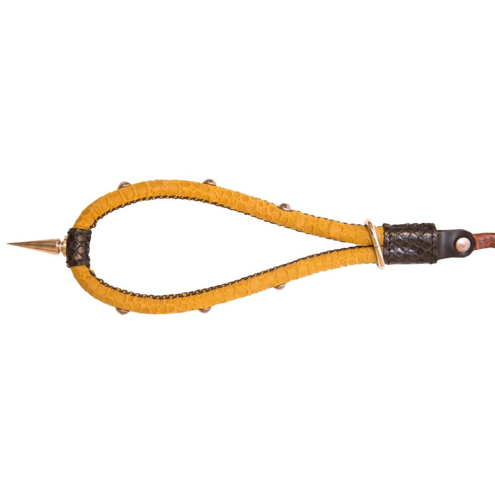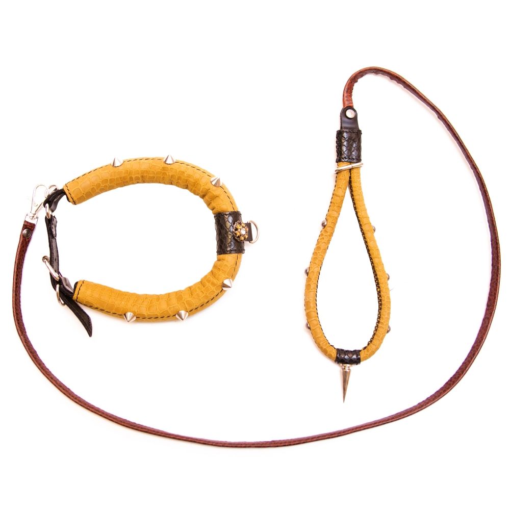Поклонникам ролевых интимных игр придется по вкусу желтый кожаный ошейник с цепочкой-поводком. Ремешок украшен металлическими шипами и стразами в виде цветочка. Ошейник пристегивается к поводку за небольшой карабин. Изделие прекрасно подойдет для БДСМ развлечений и позволит реализовать самые нескромные сексуальные фантазии.