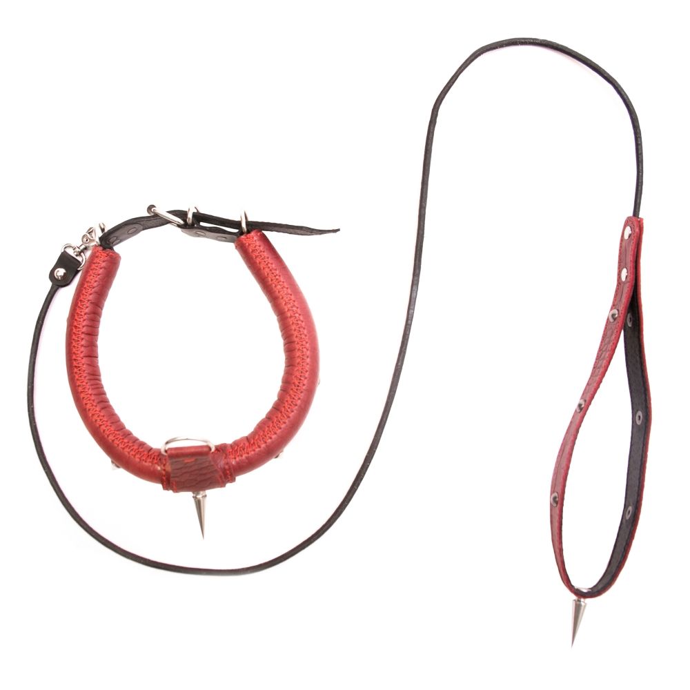 Поклонникам ролевых интимных игр придется по вкусу красный кожаный ошейник с поводком. Ремешок и поводок украшены металлическими шипами, благодаря которым они выглядят невероятно эффектно. Ошейник пристегивается к поводку за небольшой карабин. При помощи поводка Вы сможете взять под полный контроль своего партнера и направлять его движения или же одергивать в случае неповиновения. Изделие прекрасно подойдет для БДСМ-развлечений и позволит реализовать самые нескромные сексуальные фантазии.
