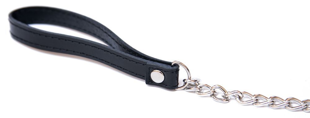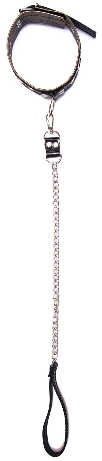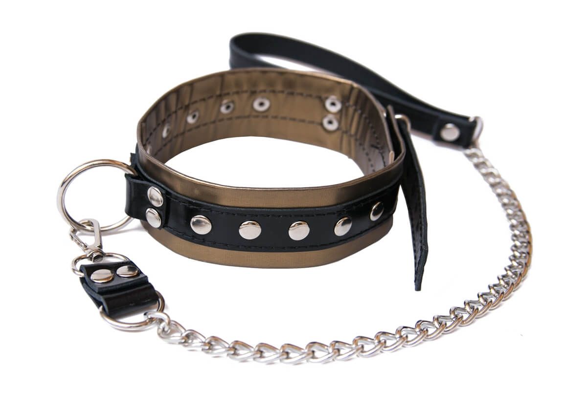 Ошейник выполнен из натуральной кожи и декорирован рядом металлический клепок, его размер регулируется. Поводок легко отсоединяется от ошейника. К металлическому кольцу на ошейнике можно присоединять и другие бондажные аксессуары.