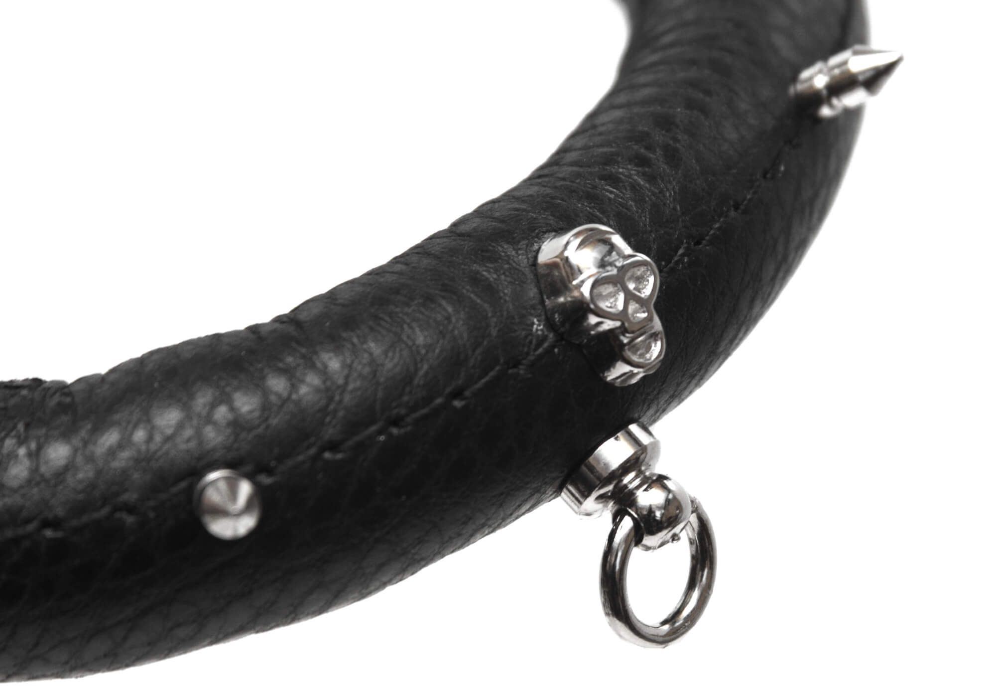 Поклонникам ролевых интимных игр придется по вкусу черный кожаный ошейник. Он декорирован металлическими шипами и небольшим черепом, благодаря которым он выглядит невероятно эффектно. У ошейника есть небольшое колечко, за которое его можно пристегнуть к поводку (в комплект не входит) за небольшой карабин, чтобы добавить играм еще большее разнообразие. Изделие прекрасно подойдет для БДСМ развлечений и позволит реализовать самые нескромные сексуальные фантазии.