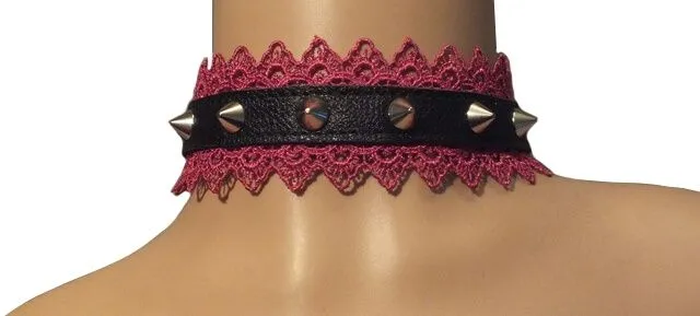 Ошейник выполнен из натуральной кожи черного цвета, украшен красным кружевом и металлическими шипами. Его размер можно регулировать застежкой. Ширина ремешка: 1,5 см.