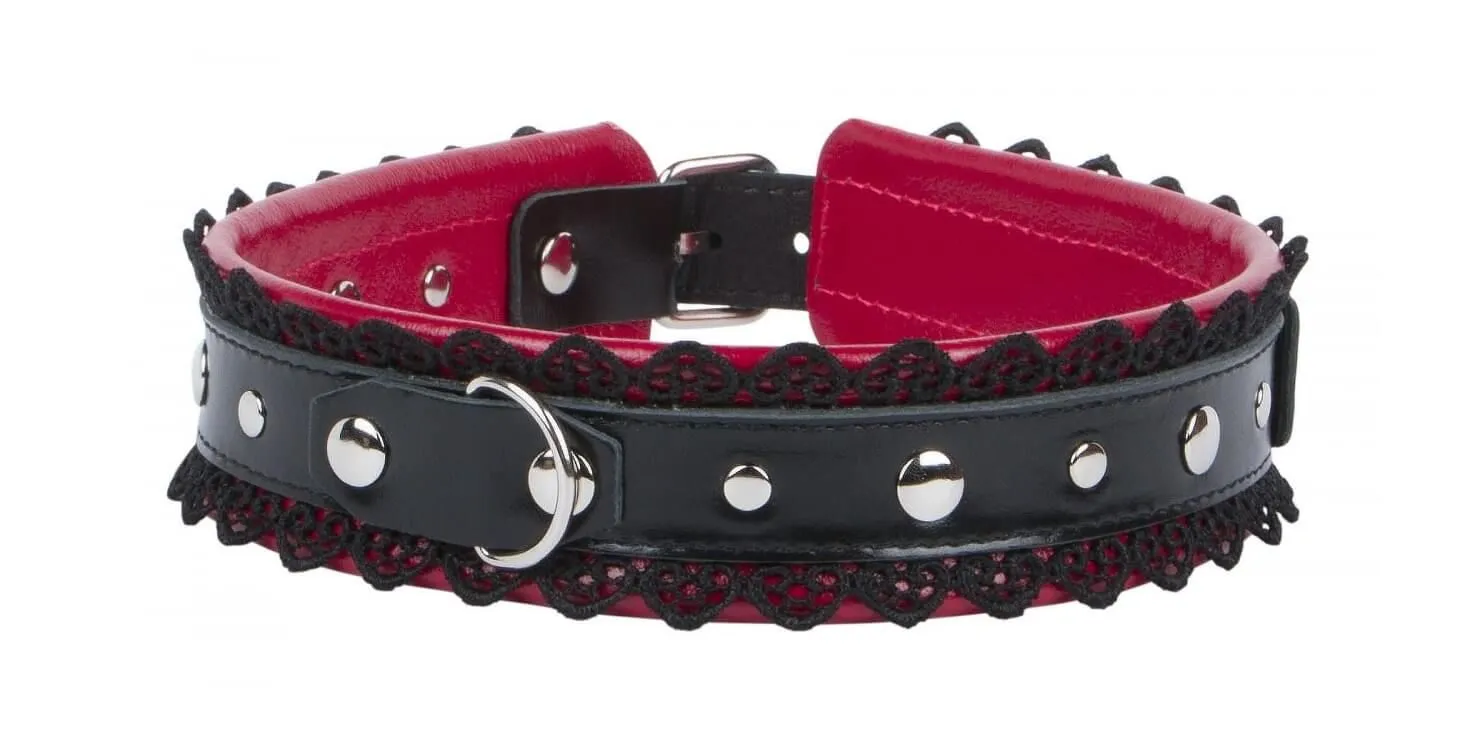 Ошейник от компании Fire Horse сделает Вашу интимную жизнь более дикой и страстной, вне зависимости от того, есть ли у Вас опыт в играх с элементами БДСМ. Ошейник выполнен в викторианском стиле из натуральной кожи черного и красного цветов и декорирован металлическими заклепками и тонким кружевом. Он будет пикантной деталью Вашего ролевого интимного костюма, благодаря которому Ваш образ станет еще более сексуальным. Во время игры ошейник может стать своеобразным символом подчинения. Также Вы можете присоединить к нему поводок или другие бондажные аксессуары благодаря наличию специального кольца.