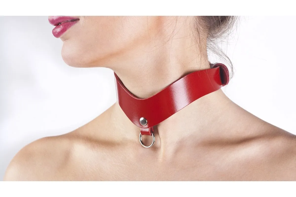 Ошейник стильной формы, единый отрез натуральной кожи и металлическое кольцо для поводка в центре.