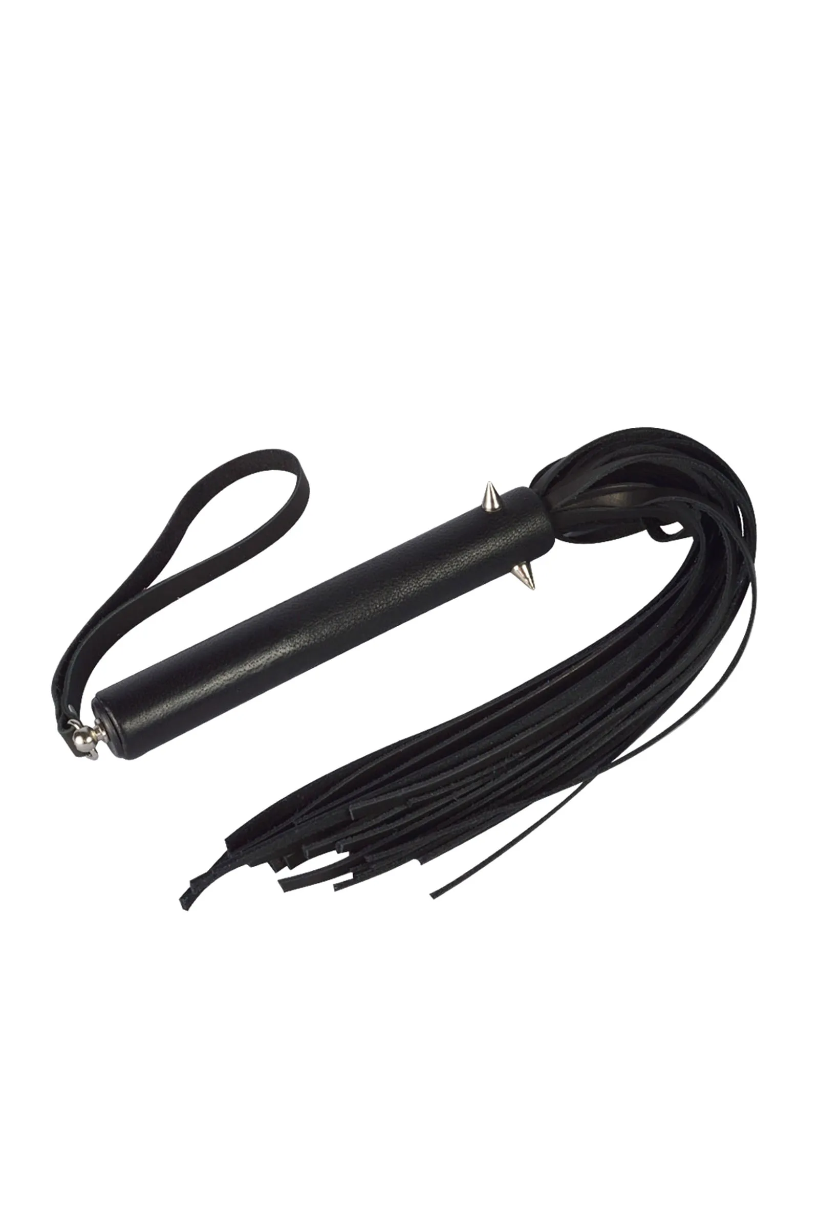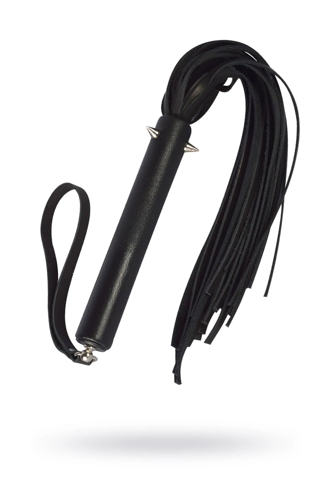 Плеть из натуральной кожи черного цвета. Ширина лент 1 см. Длина ударной части 25 см. Рукоять обтянута кожей и украшена металлическими шипами. Длина ручки 15 см, диаметр 22 мм.