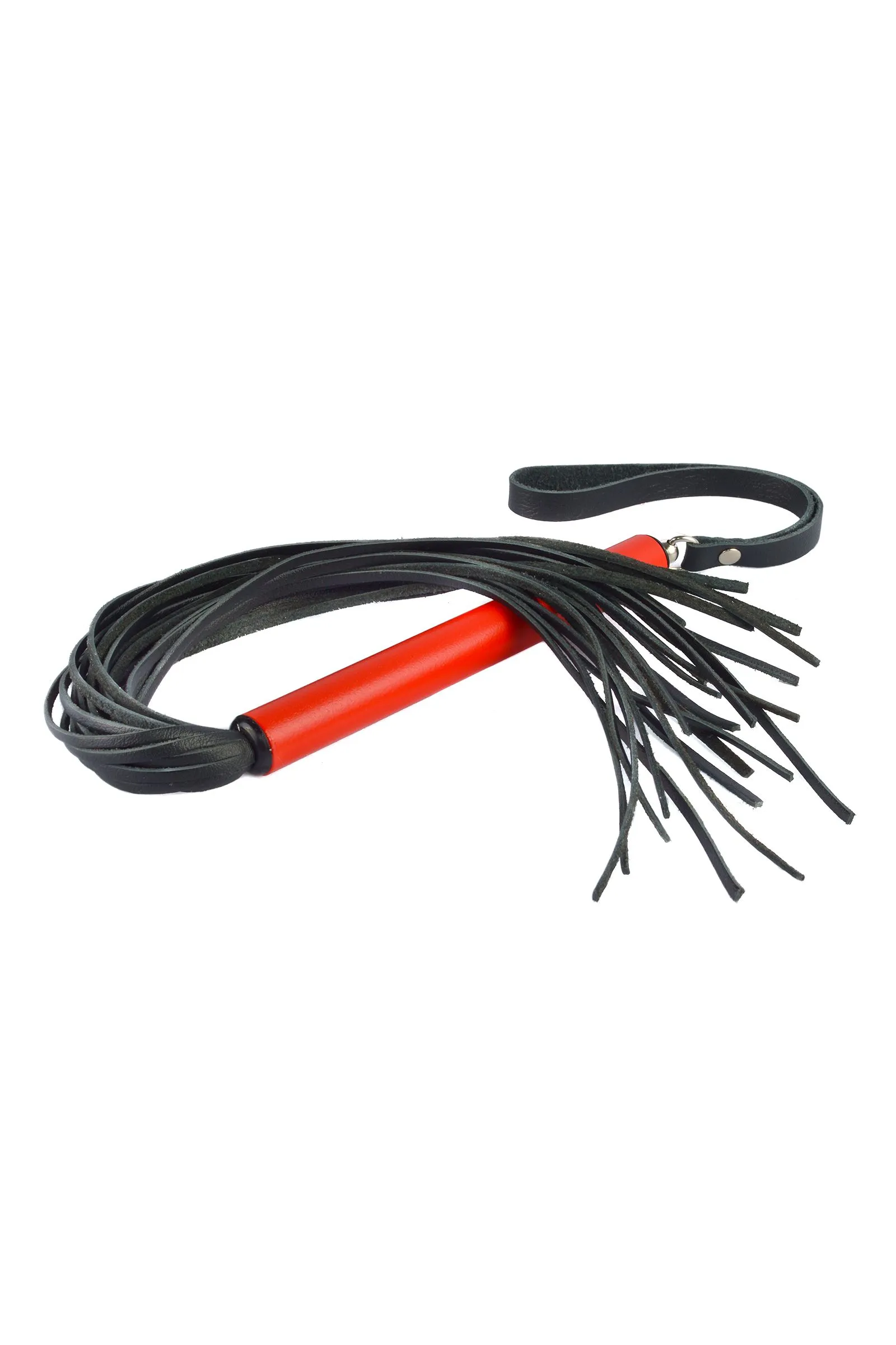 Небольшая плеть с хвостом из тонких 3-х мм лент натуральной кожи. Металлическая рукоять цилиндрической формы имеет диаметр 1,6 см, длину – 15 см. Общая длина изделия, без ремешка, 47 см. Цвет хвоста черный.