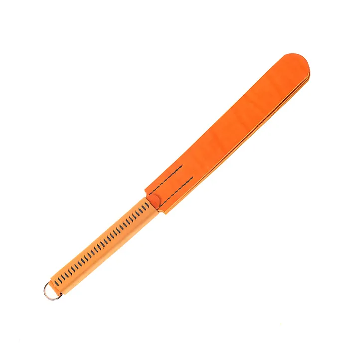 Шлёпалка сделана из натуральной кожи коричневого цвета в оригинальном дизайне с прошитой в ручную ручкой. Три язычка крепко держатся на удобной рукоятке. Наносите ей чувствительные удары по ягодицам или бедрам, которые будут сопровождаться звонкими и возбуждающими шлепками.