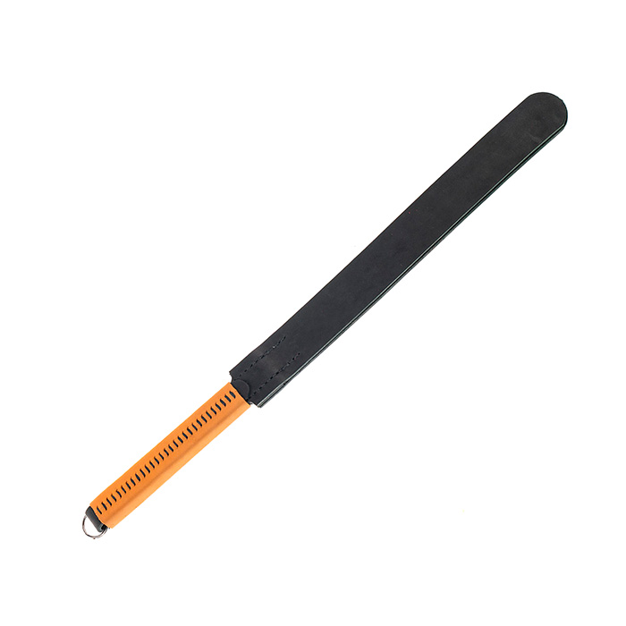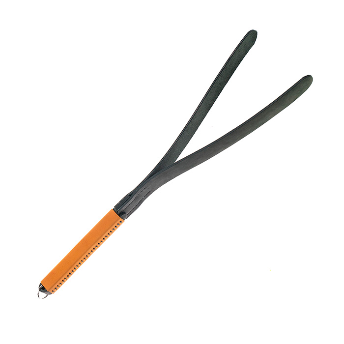 Шлёпалка сделана из натуральной кожи чёрного цвета в оригинальном дизайне с прошитой в ручную ручкой. Два язычка крепко держатся на удобной рукоятке. Наносите ей чувствительные удары по ягодицам или бедрам, которые будут сопровождаться звонкими и возбуждающими шлепками.