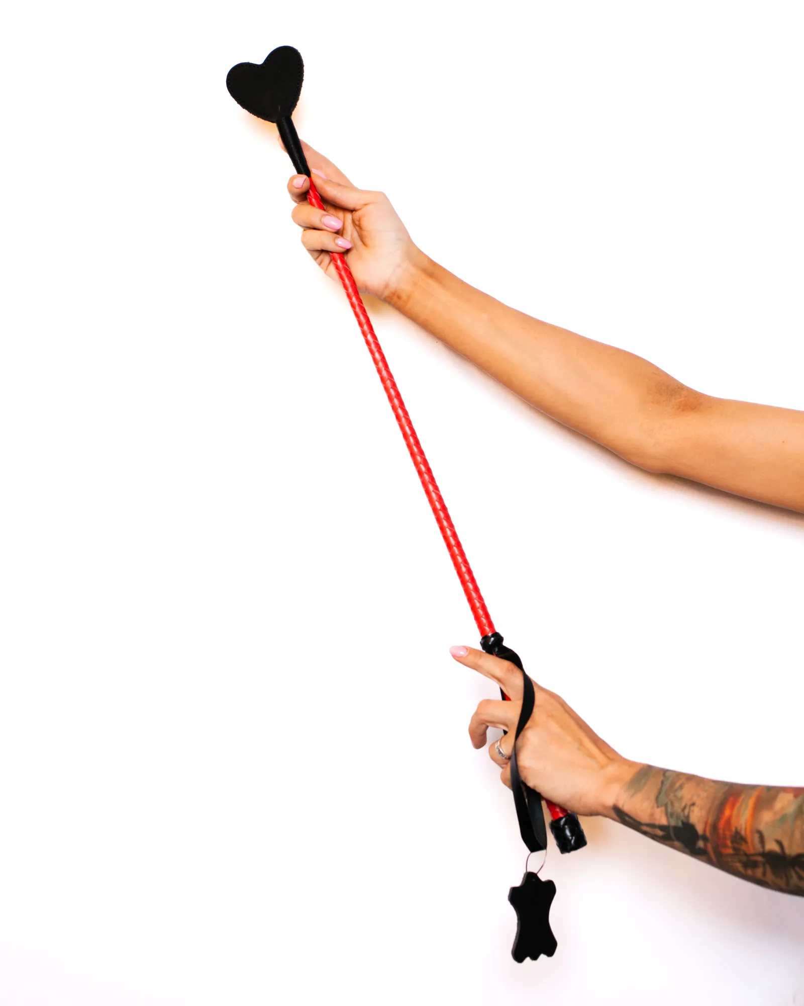 Стек из натуральной кожи премиум качества. Девайс состоит из гибкой основы, рукояти с удобной кожаной петлей для фиксации изделия на запястье и окончания-хлопушки в форме сердца из мягкой замши.