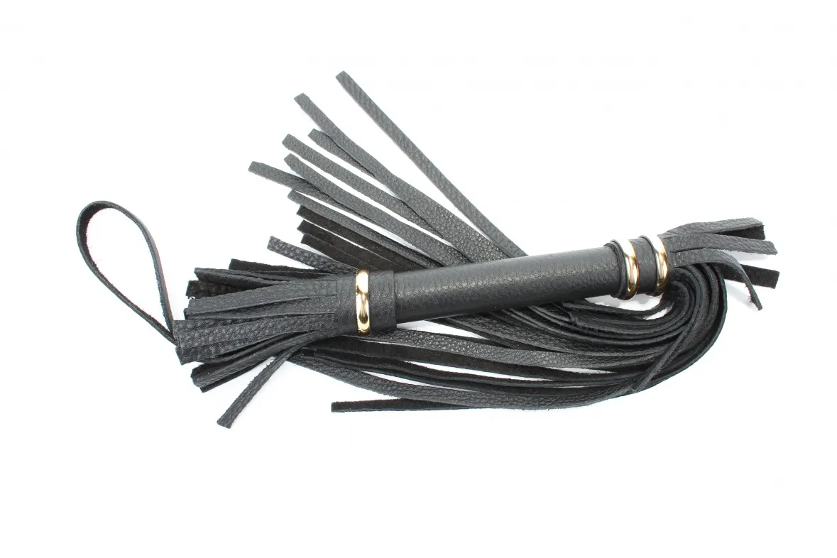 Аккуратная черная плетка, изготовленная из натуральной кожи. Имеет жесткую ручку длиной 17 см, так же покрытую кожей и украшенную золотыми кольцами. Имеется петля для удобного использования плети. Длина хлыстов - 27 см. Общая длина плети - 51 см.
