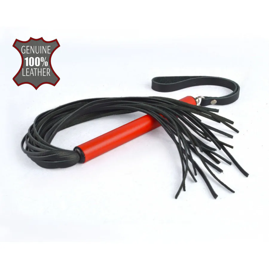 Небольшая плеть с хвостом из тонких 3-х мм лент натуральной кожи. Металлическая рукоять цилиндрической формы имеет диаметр 1,6 см, длину – 15 см. Общая длина изделия, без ремешка, 47 см. Цвет хвоста черный.