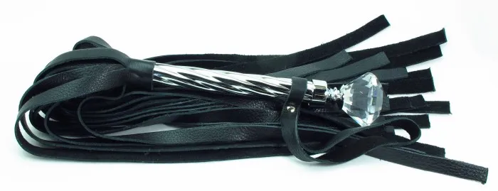 Великолепная плеть из кожи с жесткой рельефной рукоятью, украшенной кристаллом. Имеется ручка-петля для комфортного использования. Длина рукоятки - 20,5 см., длина хлыстов - 40 см.