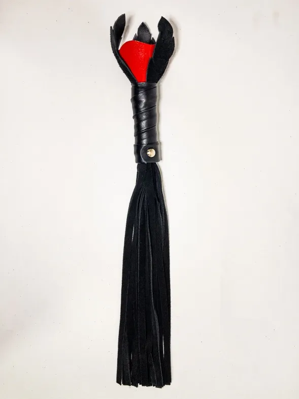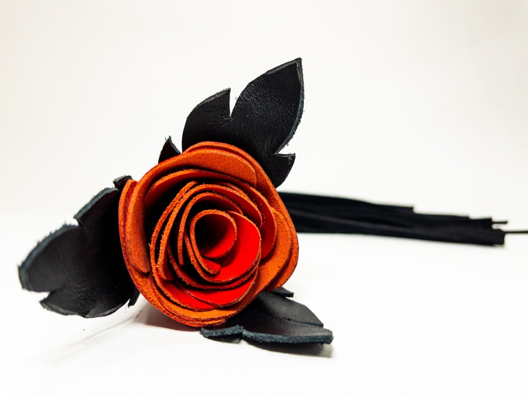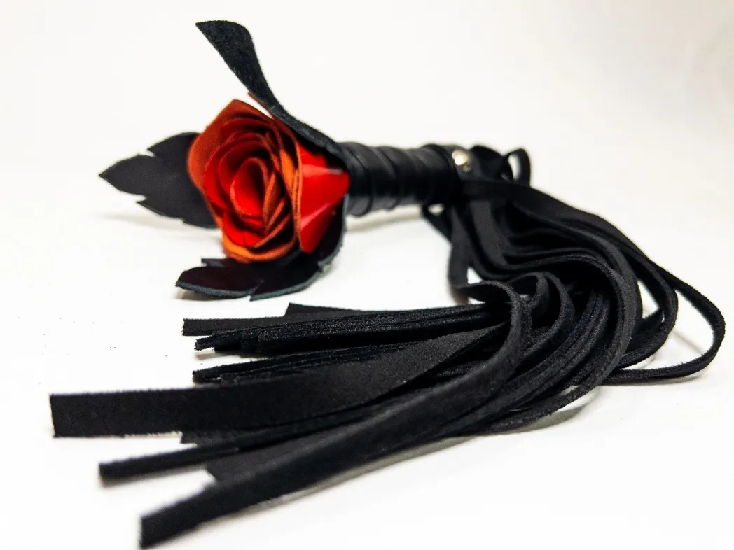 Восхитительная мини-плеть, украшенная красной розой. Цветок полностью выполнен из натуральной лаковой кожи, листочки розы и рукоятка выполнены из мягкой натуральной кожи, а хвосты плети-натуральная мягкая замша.Размеры этой плети очень изящны- общая длина всего 40см, поэтому данную плеть можно использовать, как генитальную, чтобы добавить новых ярких ощущений. Розочка очень удобно лежит в руке и создает неповторимую атмосферу и настроение, этот аксессуар никого не оставит равнодушным!