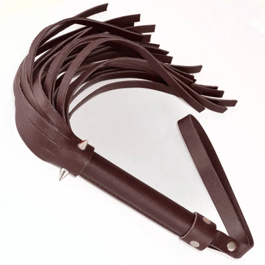 Плеть изготовлена из натуральной коричневой кожи и украшена тремя металлическими шипами. Общая длина - 40 см, длина ударной части 26 см. Длина шипов 1 см.