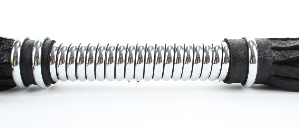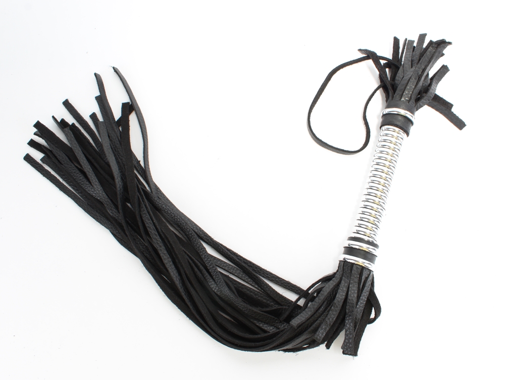Аккуратная черная плетка, изготовленная из натуральной кожи. Имеет жесткую витую рукоятку серебряного цвета длиной 16 см.. Имеется петля для удобного использования плети. Длина хлыстов - 40 см.