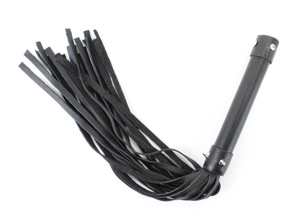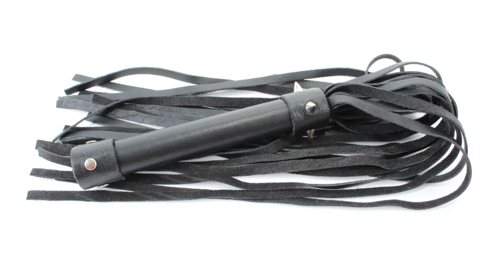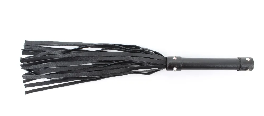 Плеть изготовлена из натуральной кожи, имеет 20 хвостов длиной 27.5 см. Хвосты имеют вид лент шириной 5 мм. Длина изделия-44 см. Украшена металлическими аксессуарами.