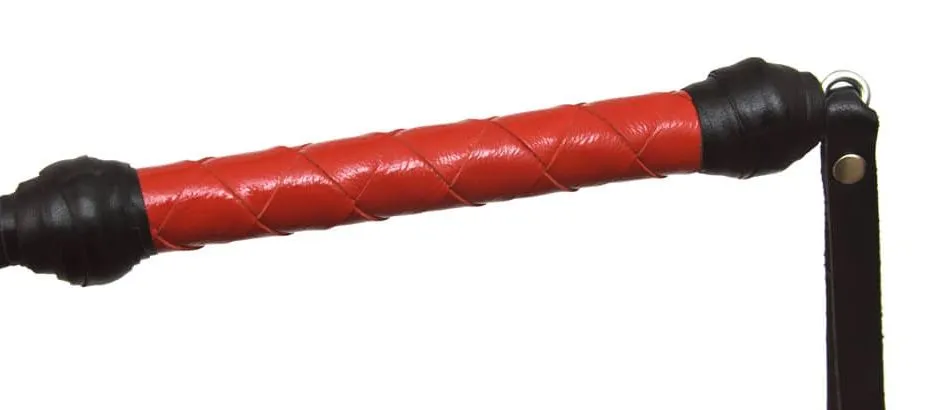 Стек длиной 70 см состоит из гибкой основы, овитой натуральной лаковой кожей красного цвета, наконечника в виде креста длиной 10 см и удобной рукояти с петлей для надевания на руку. Осторожно наносите удары, чтобы не повредить кожу узлом, с помощью которого наконечник крепится к телу стека.