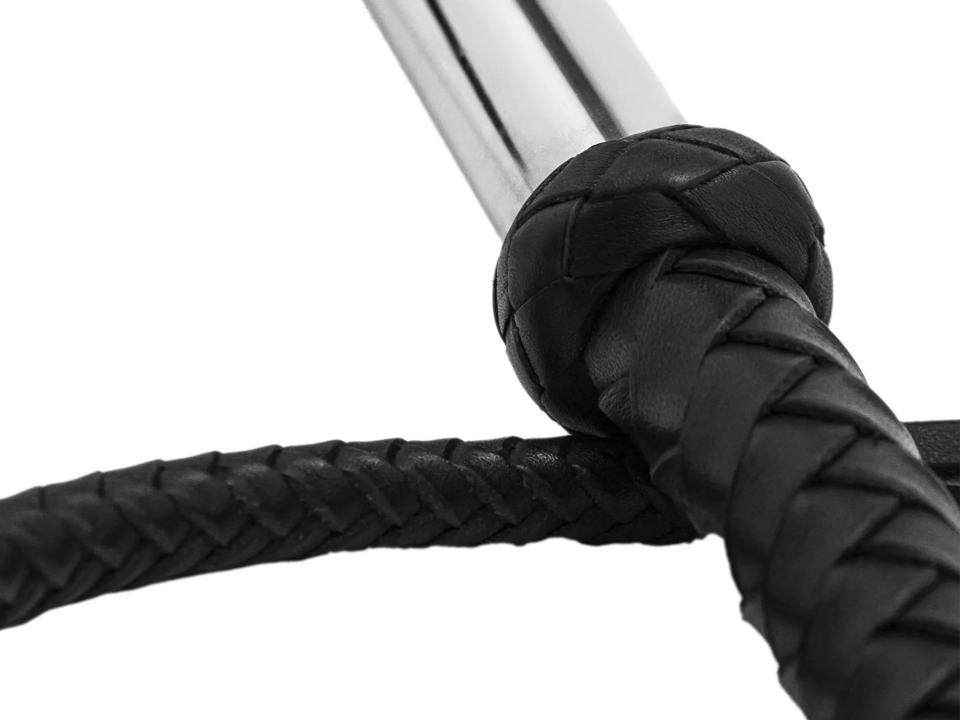 Длина 750 мм. (хромированная рукоять (200 мм.) с 2-мя ограничительными плетенными ,,бобышками,, и петлей для подвеса под нижней; переходящая в кнутовище на конус – 8-и полосное плетение ,,елочкой,, (550 мм.) – с узелком и 8-и полосной кисточкой (80 мм.) на конце. Натуральная кожа, металл.